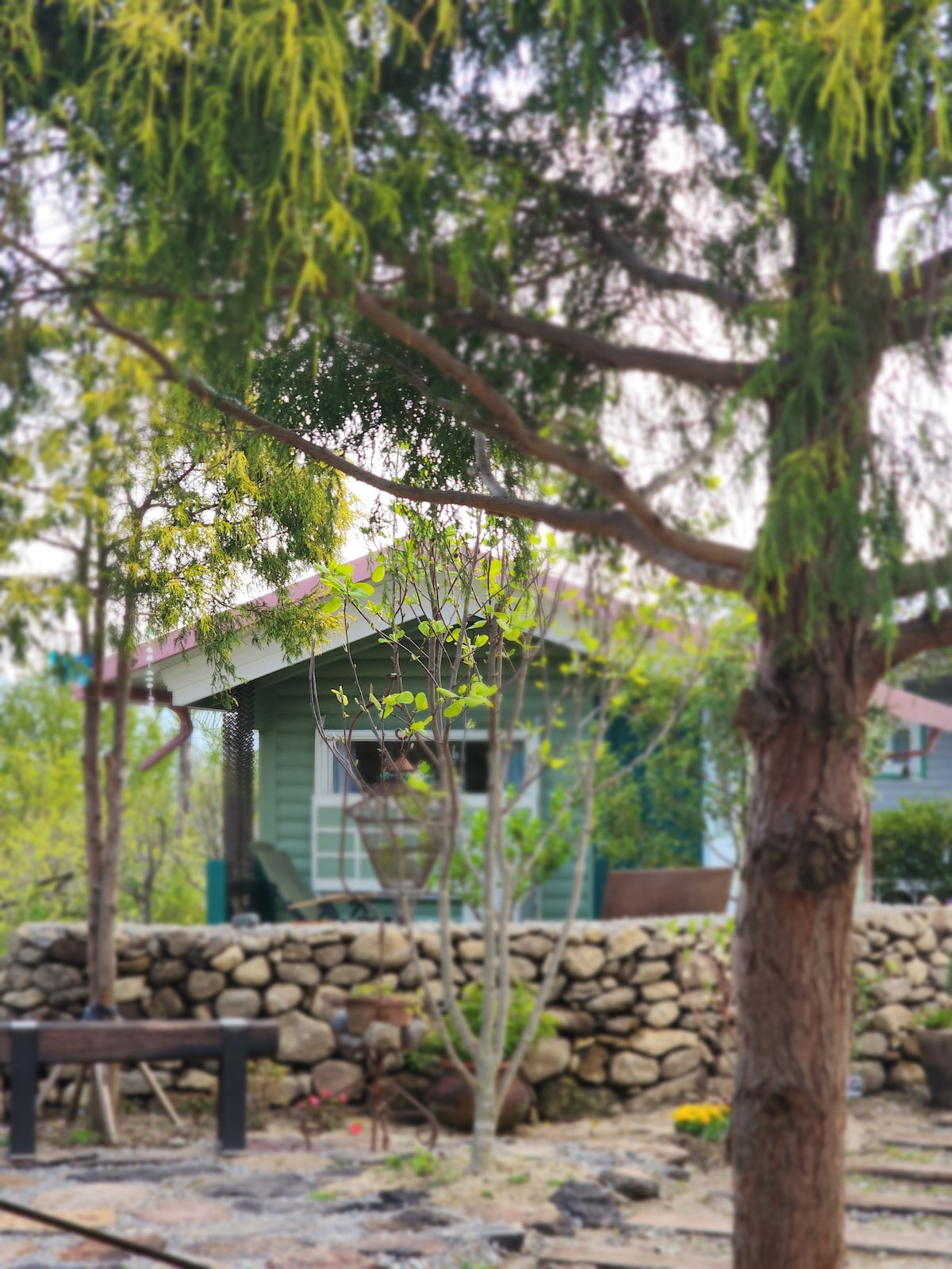 Un buen día soleado, alojamiento en Gwangyang, pensión privada, patio de césped, jardín de flores silvestres, chimenea