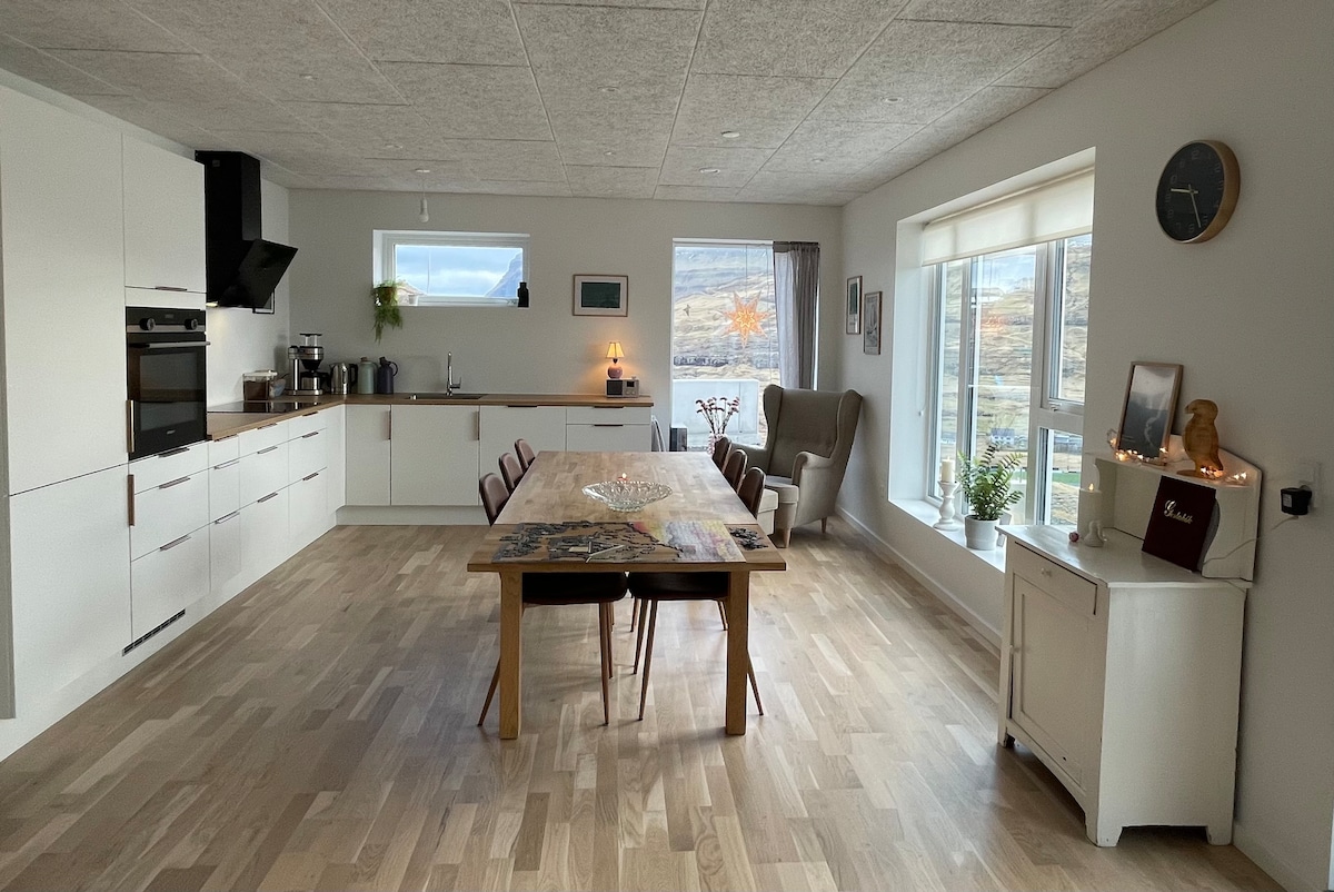 Í Fjósinum Tengo muchas ganas de quedarme en una de las casas más antiguas de las Islas Feroe. En esta casa puedes disfrutar del ambiente muy especial, de ambiente hogareño y acogedor. Aquí hay ángulos torcidos, techos bajos y una escalera algo empinada hasta el techo, pero es bueno caminar donde están 2 dormitorios y baño. En la planta baja se encuentra el pasillo, la sala de estar y la cocina, que ha sido renovada suavemente hace dos años. Tiene vistas al lago y a las altas montañas desde las ventanas.