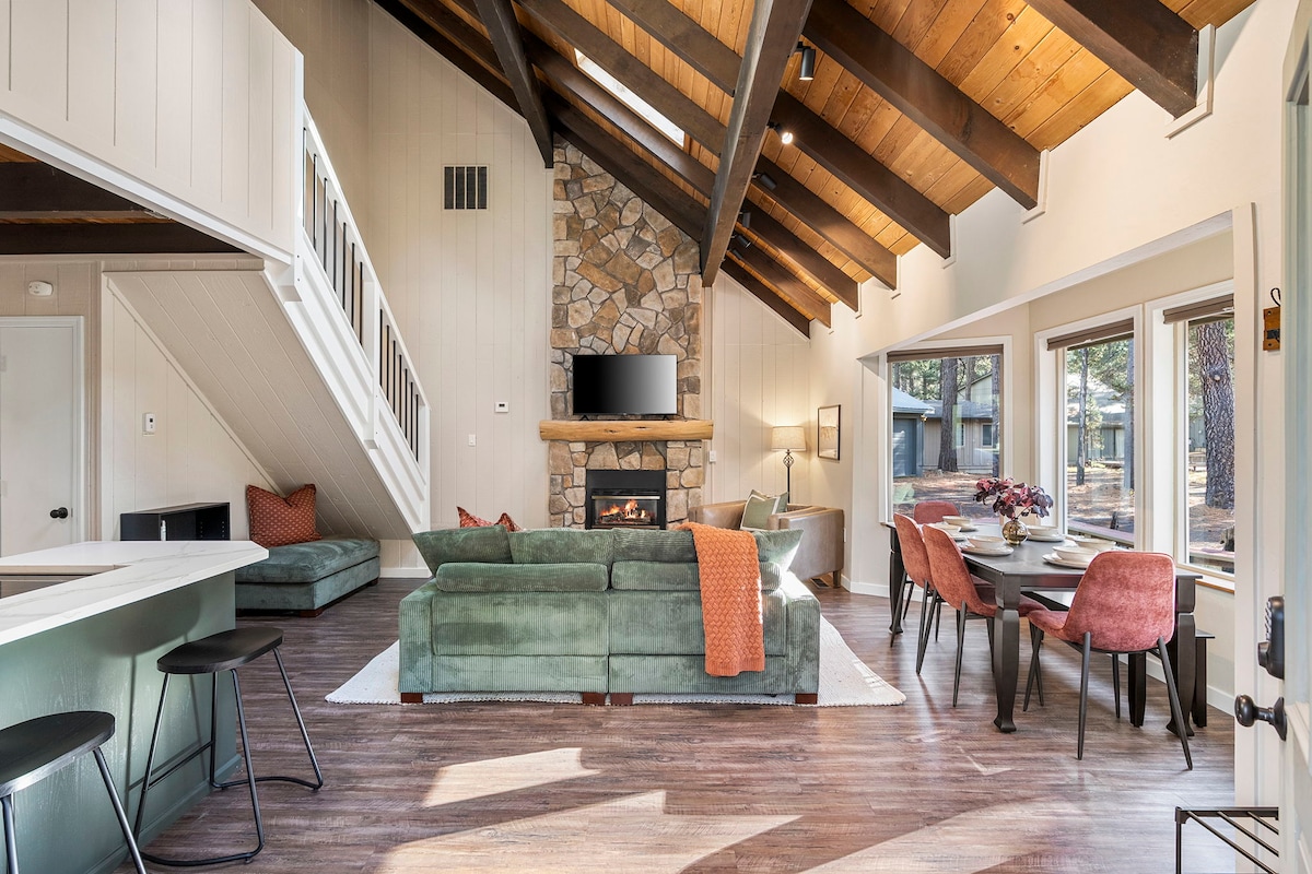 Whether you're looking for a cozy ski hideout, adventure headquarters, or just a great place to convene with friends, our 1974 A-frame is a truly unique experience in Central Oregon. With vintage charm and modern amenities, five meticulously decorated bedrooms, two living rooms, a huge dining room, a pool table, a sauna and a hot tub, this is the perfect house for couples' getaways, celebrations, and multi-family vacations. A short walk to the village, water park, and miles of bike paths.