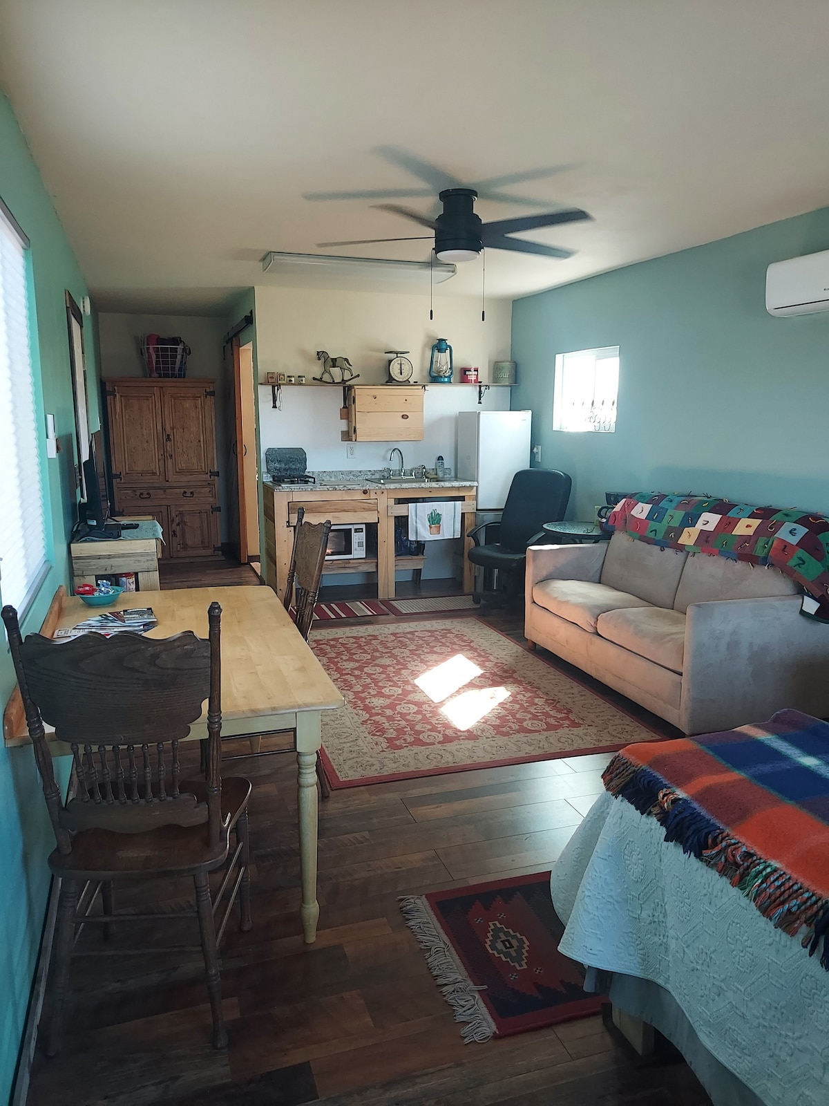 La casa de huéspedes es un edificio separado totalmente contenido. Se encuentra a 30 millas al sureste de Willcox, AZ, cerca de la cordillera Chiricahua. La casa de huéspedes ha sido recientemente remodelada y tiene aproximadamente 750 pies cuadrados de espacio habitable. El interior está decorado en decoración vaquera/mexicana/india. ¡El paisaje cuenta con montañas, pastos abiertos y cielos azules! El Monumento Nacional Chiricahua está a 4 millas de nuestro lugar. Si buscas un alojamiento tranquilo, ¡este es tu alojamiento!