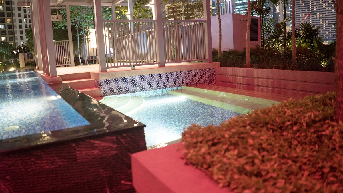 Sit back and relax in this calm, stylish space. Why Panoramic 2BR suite at Lucentia: - Best views of KL - Beautifully decorated with a fun spirit - Centrally located & attached to public transit hub - Fast wifi - 2 TVs with Netflix & others - 2 gorgeous pools - Family friendly with baby crib & highchair - Gym, pool table, BBQ pits, piano - Garage parking - Recommended to Sleeps 4 people max 6 - LaLaPort Shopping Mall & the WOW entertainment street are attached - Grocery, drug store & Cinema etc