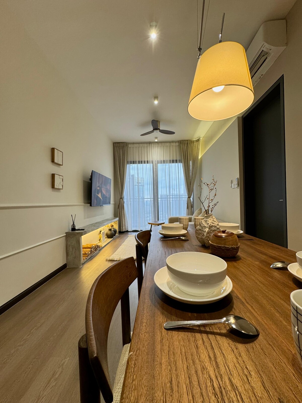 Este apartamento de 1 dormitorio cuenta con una vista impresionante del horizonte de KL. Cuenta con un salón con sofá de 3 plazas, mesa de comedor, cocina, escritorio y un gran balcón frente a la Torre KL y las Torres Petronas. Viene con TV de 55 pulgadas, wifi de alta velocidad y una cama tamaño queen en la que puedes acomodarte cómodamente. *La otra unidad de este apartamento de llave doble es un estudio compacto con cama tamaño queen, despensa, baño y bañera. Pueden caber amigos que viajan contigo con privacidad. ¡Te invitamos a solicitar más información!