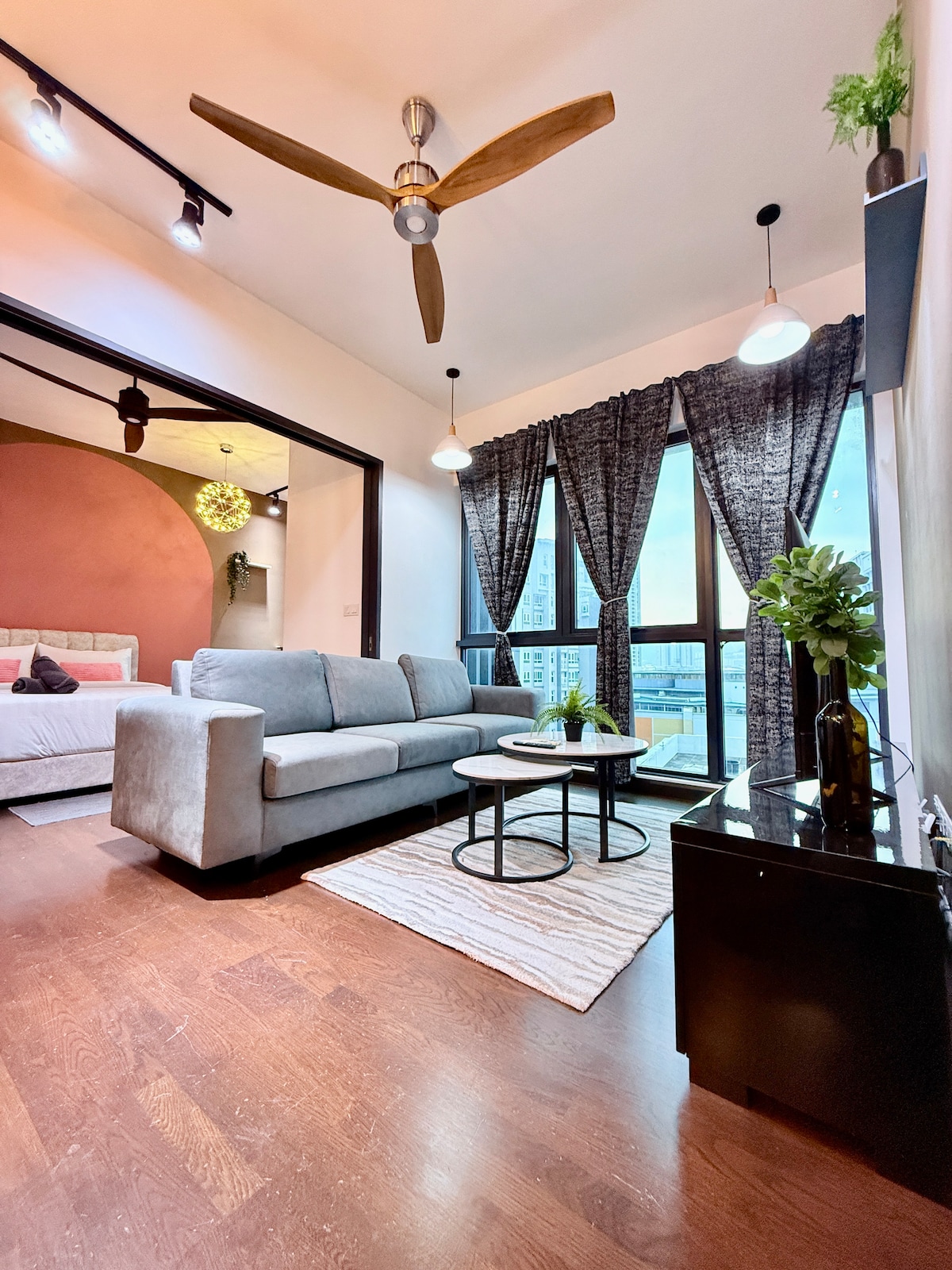 📍Pertama Residency Welcome to my New Bnb - Moonrise City! Este estudio está recién preparado con mucho amor, combina la decoración contemporánea con comodidades modernas y una experiencia, todos pueden disfrutar especialmente del momento del jacuzzi con tu amor y pantalla de proyector de 120pulgadas con Netflix. Este lugar único tiene un estilo propio, ofrece un ambiente acogedor, limpio, tranquilo y refrescante para parejas. ¡Ven y experimenta en el nuevo bnb! Nos vemos.