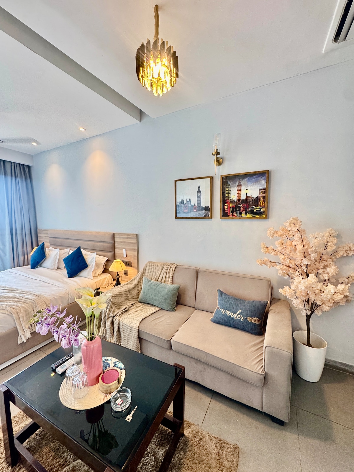 Disfruta de una estancia serena y elegante en el corazón de Supernova, Noida. Este dormitorio boutique bellamente diseñado combina la comodidad moderna con la elegante estética tropical. Con una lujosa cama tamaño king enmarcada por suaves cortinas transparentes, una cálida iluminación ambiental y una pared decorativa de diseño, el espacio es perfecto para relajarse después de un largo día. Despiértate con impresionantes vistas a la ciudad desde el balcón y disfruta de un ambiente tranquilo y acogedor realzado por muebles de primera calidad.