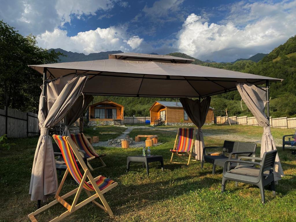 * Las bonitas cabañas están situadas entre el bosque y el jardín. * A 5-10 minutos a pie del centro de Mestia, lo suficientemente cerca de la ciudad pero lejos del ruido. * Hay comodidad y puedes sentir la cercanía a la naturaleza. * Aquellos que aman la naturaleza y estar cerca de ella definitivamente podrán relajarse aquí. * Las cabañas están separadas entre sí (unos 50 metros) y cada una tiene suficiente espacio en el patio para que los huéspedes de diferentes cabañas no perturben la relajación y las actividades al aire libre de los demás.