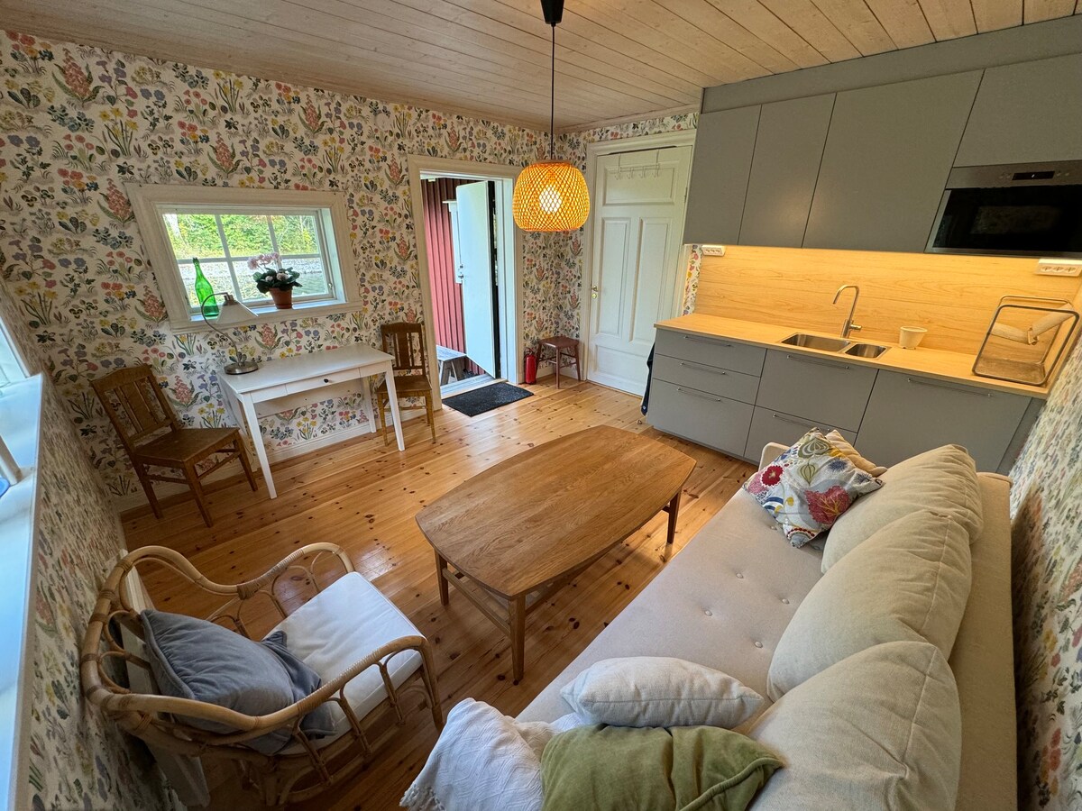 Cabaña bien equipada y fresca en una parcela compartida junto al mar con vistas al mar. La cabaña está dividida en una sala común con cocina y sala de estar. Desván con 2 camas individuales. En el salón hay 1 sofá cama con capacidad para 2 personas. La cocina está equipada con nevera con congelador, cocina, microondas, hervidor de agua y cafetera. Comedor para 4 personas. En la sala de estar hay un sofá, una mesa, sillones, un televisor y una acogedora chimenea. El baño consta de un gran cuarto de ducha, sauna y WC separado. Gran terraza con grupo de salón y parrilla.