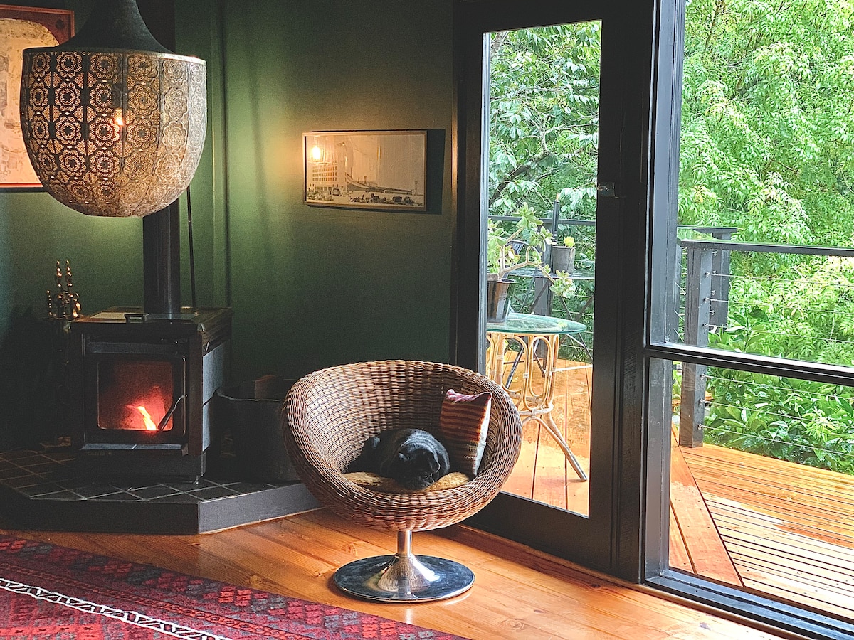 An Intimate & Charming, Self-Contained Hilltop Hideaway Designed for relaxation & privacy throughout your stay. The comfortable & cosy accomodation specifically tailored to romantic, relaxing escapes or a peaceful getaway for two close friends to enjoy a quiet catch up Enjoy the eclectic rustic interiors & indoor fireplace. Dedicated private & leafy guest courtyard with firepit, vintage outdoor bath tub, and wood-fired pizza oven for an immersive mountain stay