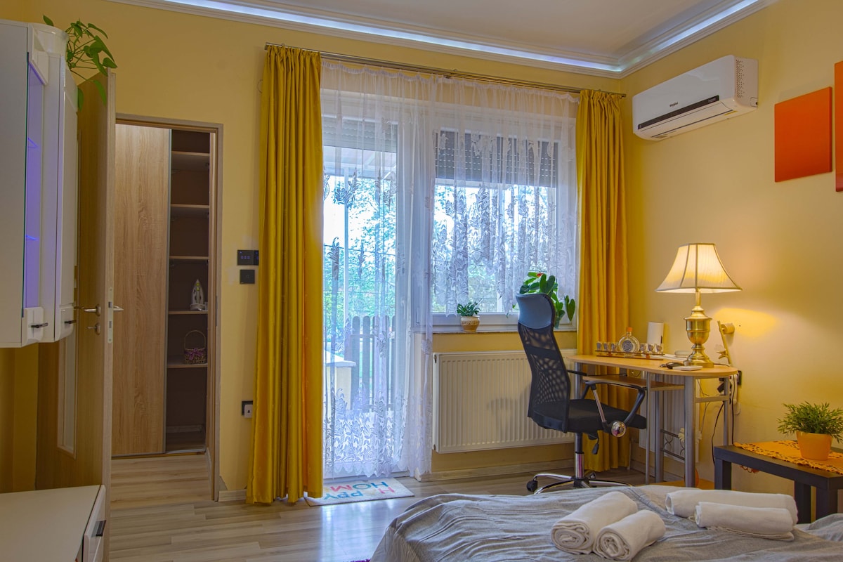 Una espaciosa casa familiar en la planta baja de 130 metros cuadrados, 2 dormitorios, una sala de estar con una sala de estar, una cocina totalmente cubierta, un baño y un aseo separado. Cuenta con dos ambientes autónomos, un enorme jardín, una terraza. Situado a sólo 20 km de Budapest, Érden, una popular y moderna ciudad suburbana. En la cocina, ofrecemos café y té GRATIS para nuestros huéspedes con estufa, horno, microondas, refrigerador, hervidor de agua, tostadora. Puedes usar toda la planta baja y el jardín.
