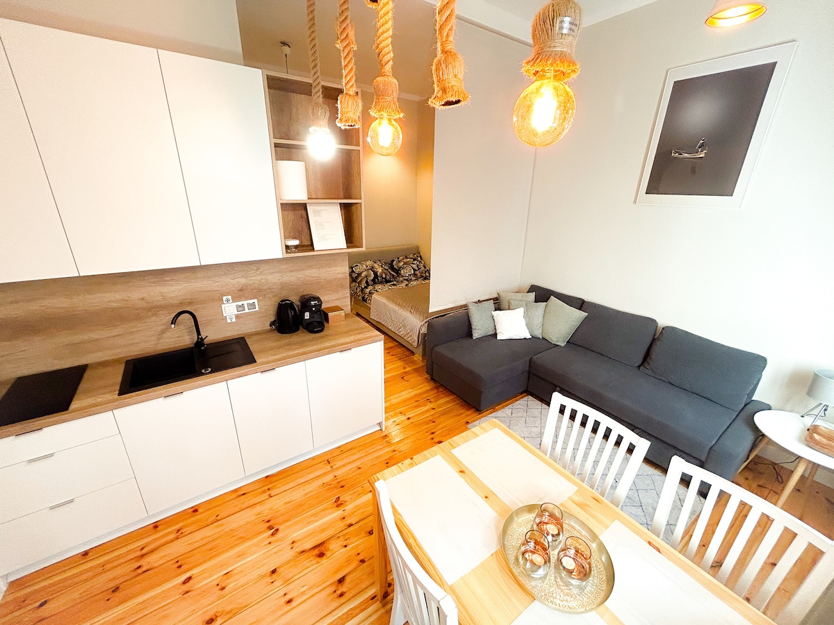 Un estudio diseñado para dos personas que valoran la comodidad y la privacidad. Excelente ubicación en el centro de Szczecin! Se tarda 17 minutos en llegar a la estación de tren (en tranvía):). Muy cerca hay tiendas: Żabka, Społem y una panadería. El apartamento esta en la primera planta