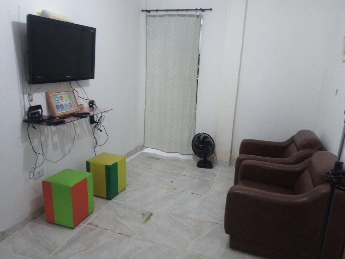 Casa de huéspedes con una superficie de 40 m² y todos los elementos esenciales que necesitas para tener una gran estancia. Amplio dormitorio con cama doble, mesita de noche, armario y TV inteligente digital; baño completo con ducha eléctrica; cocina con estufa de gas, horno microondas y utensilios; habitación de tipo americano donde puedes usar para tus comidas e incluso para trabajar. No hay garaje. Estamos a 1,4 km de la autopista régis bittencourt, mercados cercanos y a 2,5 km del centro comercial Taboão.