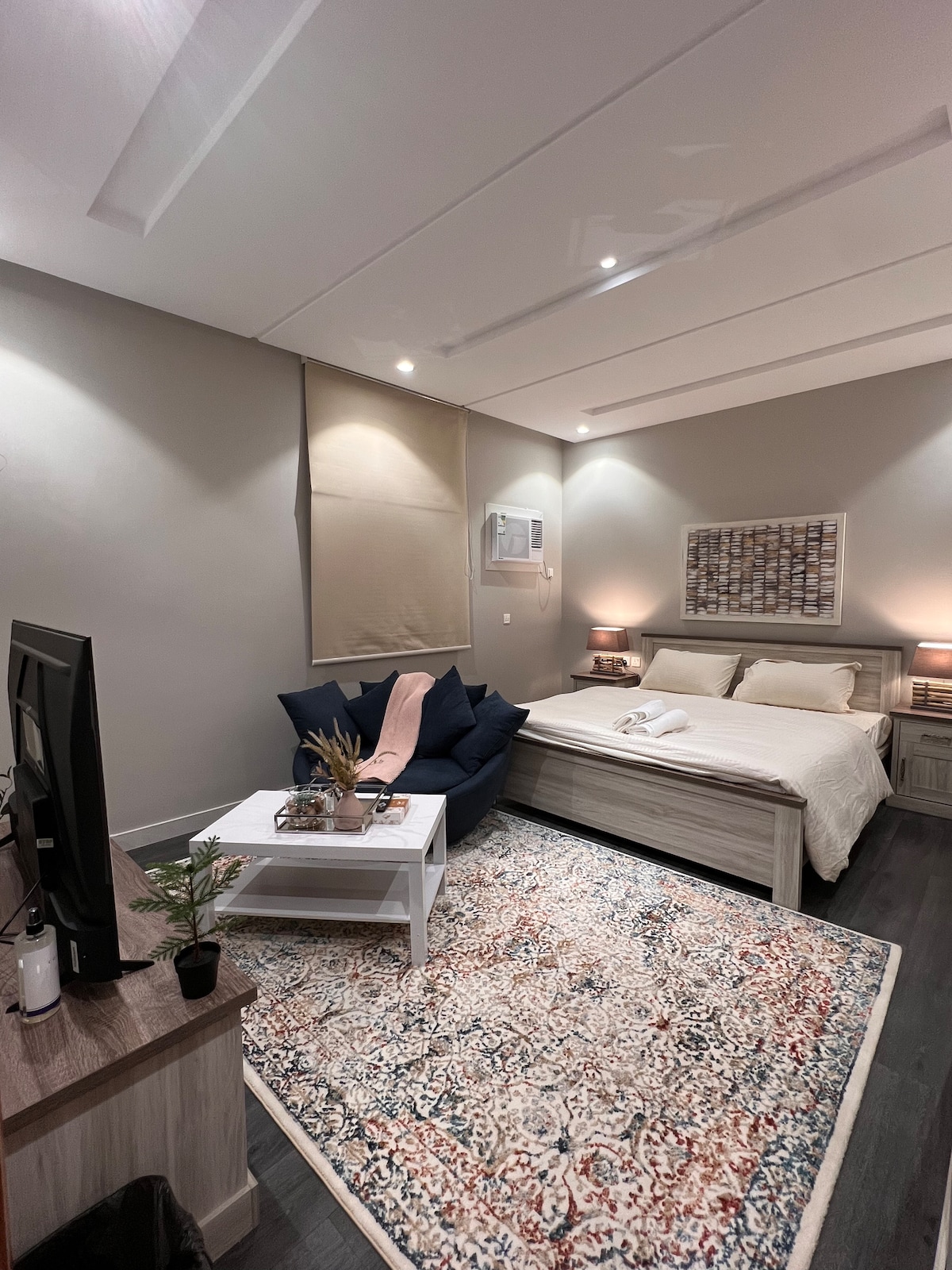 استرخ في هذا المسكن الفريد والهادئ ، ستديو بغرفة نوم خاصه يسع لشخصين . يتوفر فيه جميع المسلتزمات المتعلقه بالسكن من : - مطبخ خدمه صغير يتكون من ( مايكرويف ، غلاية ماء ، آلة قهوة لتحتسي قهوة هادئ ) - غرفة نوم بسرير كينغ مع خزنة ملابس ، ايضا تلفزيون ذكي بشاشة مسطحه مع اريكه دائره مصممه بشكل عصريه . - حمام مخدوم بجميع الأدوات اللازمه . يتسع المكان الى شخصين . يمتاز المكان بوجوده في منطقة حيه على شارع تجاري وقريب جدا من الكافيهات والمطاعم وايضا المطار .