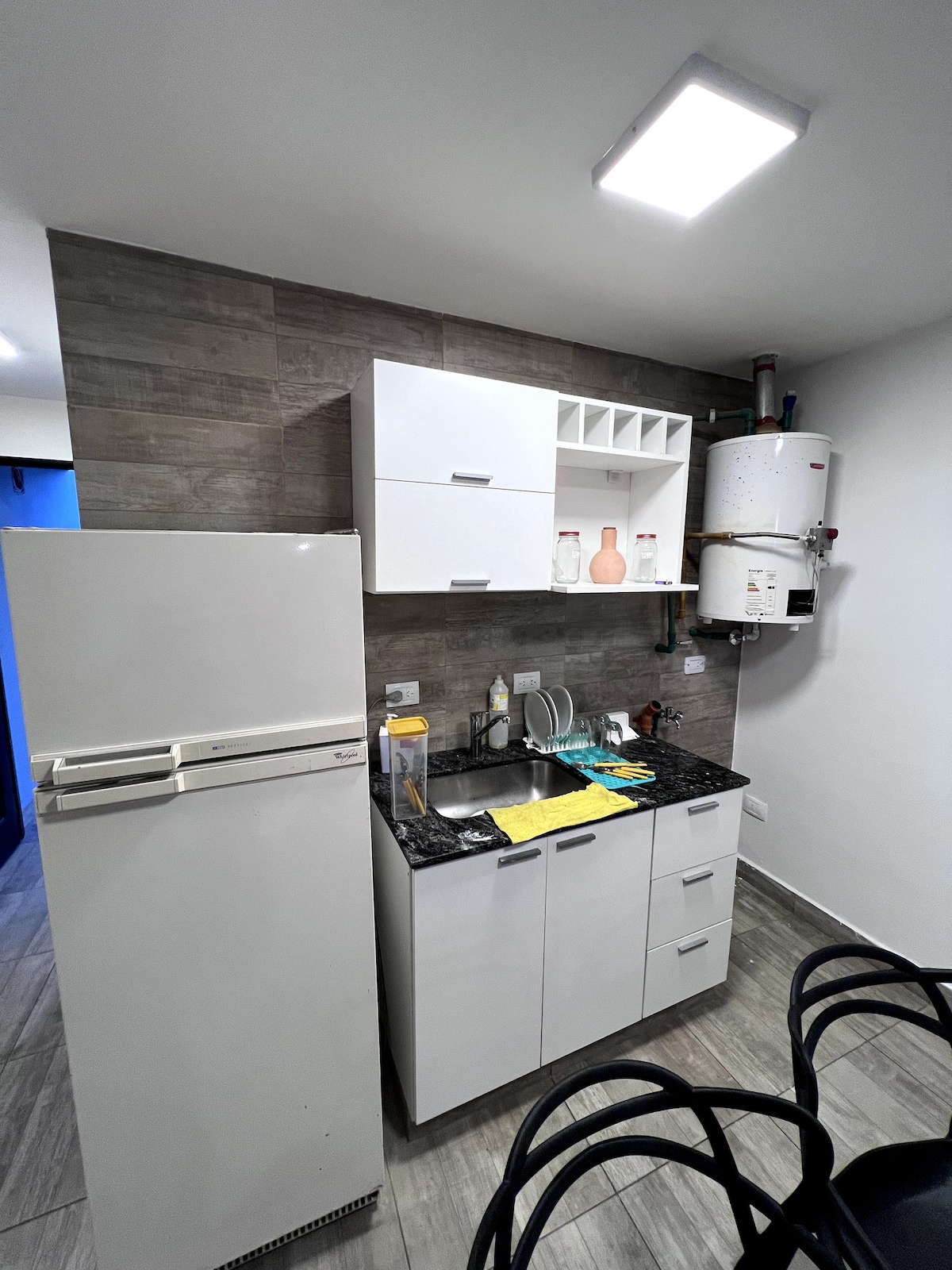 Monoambiente Cómodo y acogedor para dos personas. La cocina esta separada del dormitorio por un separador que sirve para acomodar la ropa. Cuenta con aire acondicionado, televisión de pantalla plana, comedor, pava eléctrica, cocina , frigobar y microondas, toallas y ropa de cama. También tiene un hermoso balcón para disfrutar de una merienda, un trago o charla. En el piso 15 se puede disfrutar de una pileta y una terraza con hermosa vista a la ciudad y al cerro.