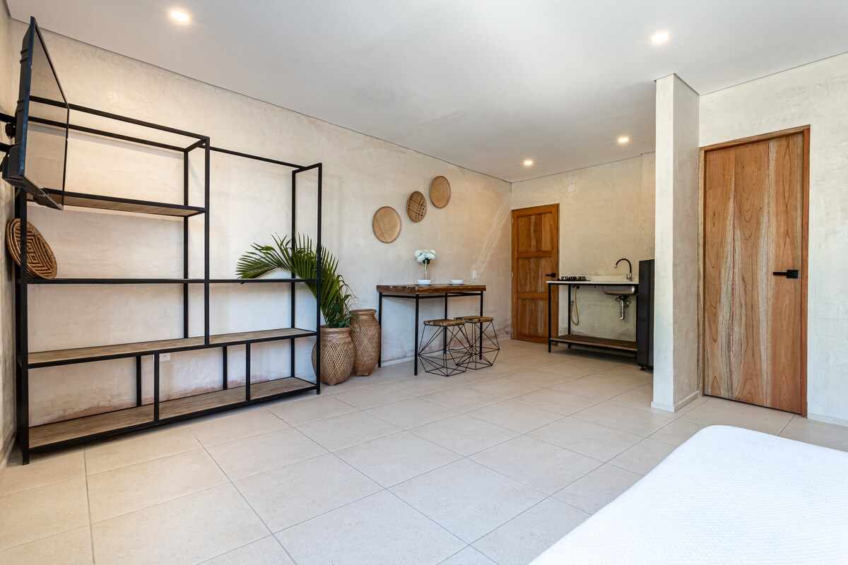 Disfruta tu estadía en Taganga con una maravillosa vista a la bahía rodeado de naturaleza. Apartamento de un espacio en primer piso con baño privado, cocina, sala y aire acondicionado, muy espacioso y super tranquilo, contamos con una terraza común en piso superior con vista. (La habitación no tiene vista directamente al mar) Relájate en este tranquilo lugar lejos del ruido y a 500 metros de la playa, donde puedes disfrutar tu desayuno con una excelente vista al mar.