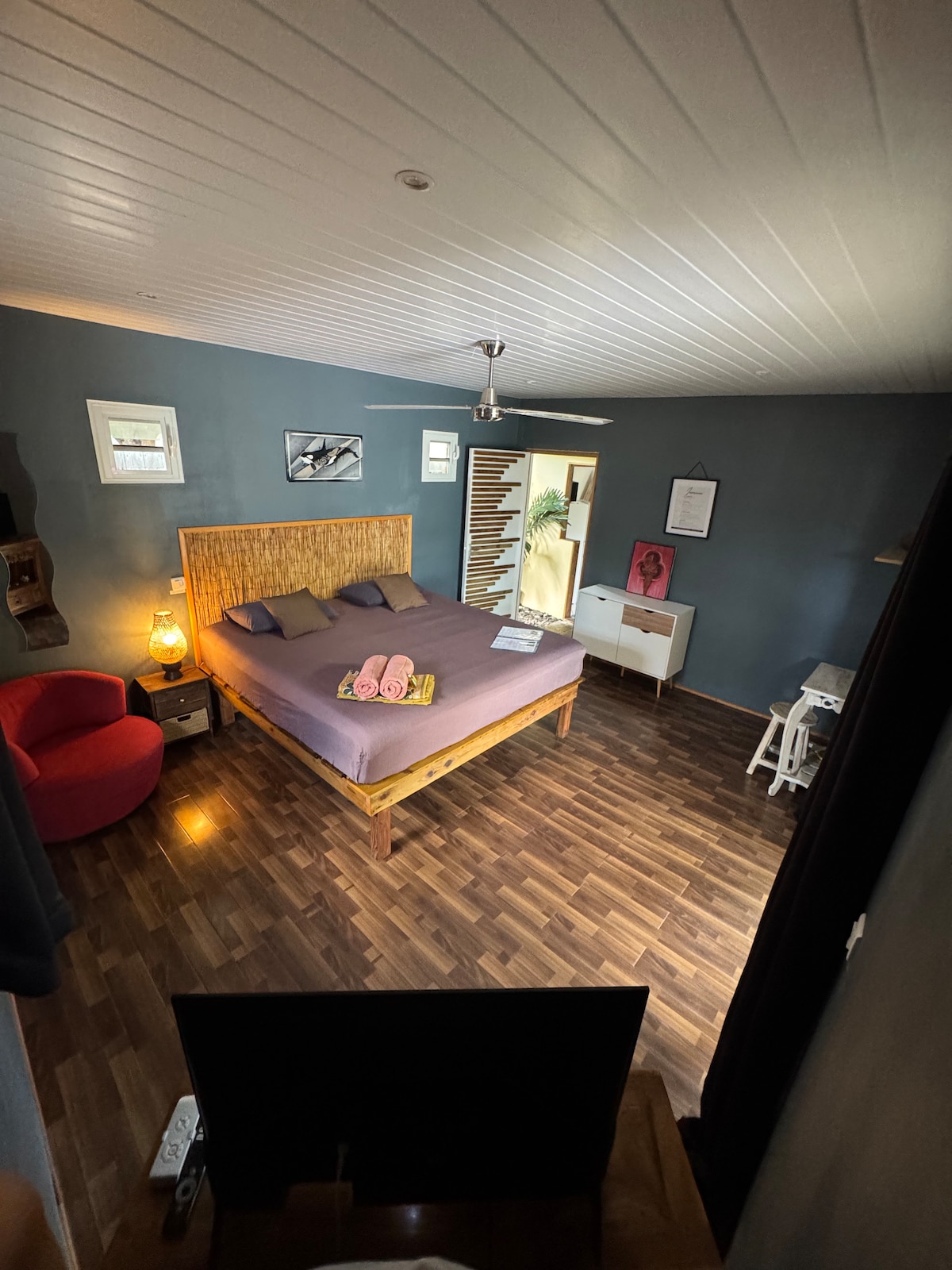 En las exuberantes colinas de la isla más pequeña de Tahití, Le Studio te da la bienvenida en el corazón de la vegetación tropical polinesia. Esta pequeña casa de madera, abierta al jardín, ofrece un acogedor refugio natural ideal para una pareja, una familia o un grupo pequeño. Animales en libertad, un jardín animado y un ambiente auténtico dan forma a la experiencia. Le Studio tiene capacidad para un máximo de 3 huéspedes. A partir de 4 huéspedes, se proporciona un dormitorio adicional detrás de La Galerie, la gran casa ubicada justo al lado.