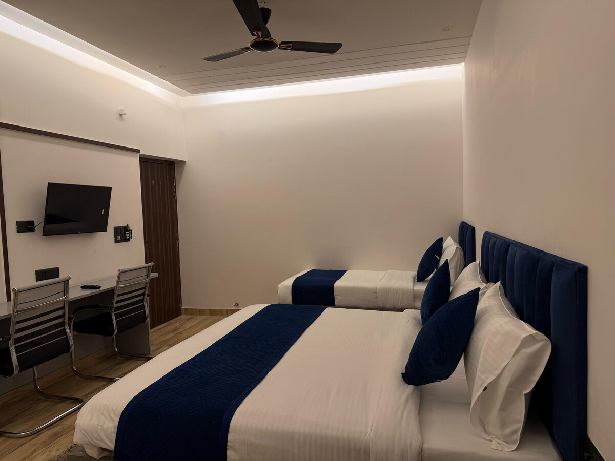 Disfruta de la comodidad y la comodidad en nuestro alojamiento familiar de nueva construcción, que ofrece habitaciones totalmente amuebladas diseñadas para una estancia relajante. Ubicada a pocos minutos del mundialmente famoso Taj Mahal y el fuerte de Agra, nuestra propiedad es el lugar perfecto tanto para hacer turismo como para relajarse. Disfruta de servicios modernos como wifi gratuito, aire acondicionado y agua caliente las 24 horas, los 7 días de la semana en un vecindario tranquilo y seguro. Con cafeterías cercanas, restaurantes en la azotea y mercados locales, todo lo que necesitas está a la vuelta de la esquina.