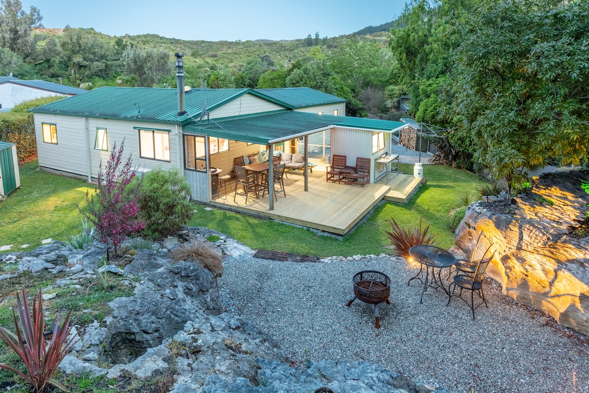 This quiet cottage is nestled amongst mature native trees in iconic Totara Avenue, 10 mins from Collingwood, and overlooking a tidal estuary and bush-clad hills, with the beach just over the road. The spacious open plan kitchen, dining, living area is private and sunny. The main bedroom has a queen bed, while the second bedroom has a queen and two singles in a bunk. Kōtuku has a wooden deck along two sides, where you can sit and enjoy the view, or you can watch the tides from a private jetty.