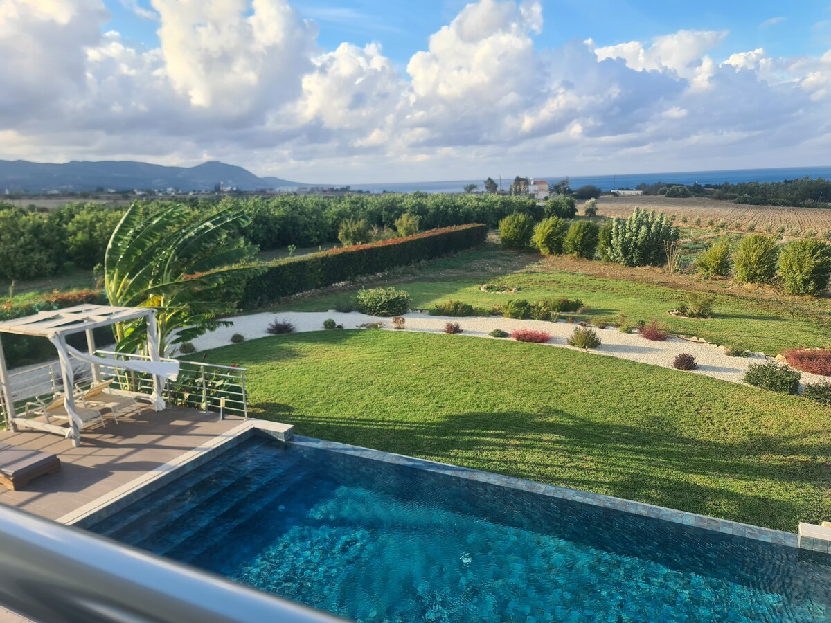 Open plan living room with TV & fireplace and guest WC. Fully equipped kitchen with concealed [A/C], kitchen island with stools for dining. Direct access to the outdoor through full-screen balcony doors with sea view. 3 Bedroom villa with [A/C} and ensuite bathrooms with showers bath tub-access to the outdoor veranda with views of the ocean. Outdoor infinity pool, sun loungers, BBQ alfresco dining, hot tub with spectacular views of the mountains and sea..