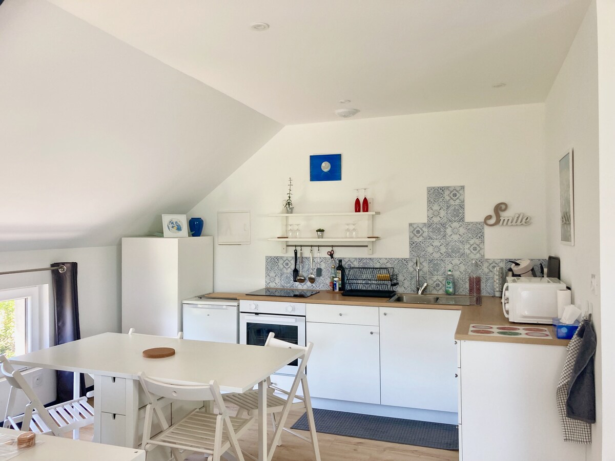 Gîte cozy au calme, avec 1 chambre. T1 bis. Tout équipé dans un style atelier avec poutres apparentes. Au 1er étage d’une petite maison indépendante (pas de location en bas), vous apprécierez sa terrasse en bois, sans vis à vis exposé sud/ouest. Idéal pour vos séjours loisirs ou professionnels, pour un week end, quelques jours, ou semaines...Situé dans le centre bourg de Breteil et à mi chemin entre la capitale Bretonne (20km), et la Forêt mythique de Brocéliande (24km). accès train 8mn à pied