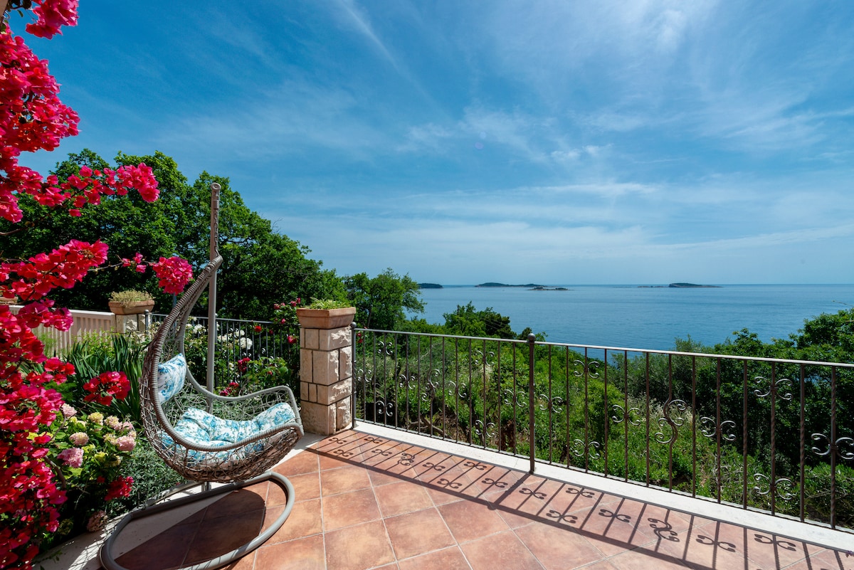 Ubicado en la encantadora villa, este apartamento elegantemente amueblado cuenta con tres dormitorios, dos baños, una enorme terraza con jacuzzi exterior, una cocina totalmente equipada (lavadora, microondas, tostadora, cafetera, hervidor de agua), comedor y zona de estar. La propiedad cuenta con unas magníficas vistas al mar Adriático y a las islas. Aire acondicionado en todo el apartamento. Wifi gratis y artículos de tocador.