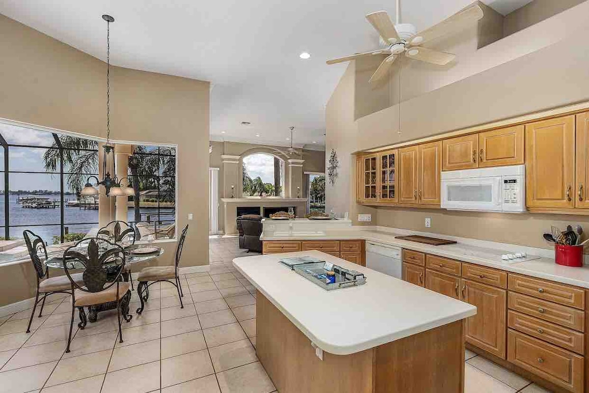 ¡UNO DE LOS MEJORES PASEOS MARÍTIMOS DE CAPE CORAL! A pocos pasos de la playa. Esta casa de más de 2500 pies cuadrados tiene impresionantes puestas de sol y vistas al agua del suroeste desde todas las salas de estar principales, así como desde la suite principal. Piscina climatizada con iluminación LED de colores, spa incorporado, baño de piscina, lavandería completa, Lanai, chimenea, wifi y televisores en cada dormitorio, muelle privado. Barco en elevador para alquilar con alquileres RPM. Amplio garaje para 2 coches con 5 bicicletas, carro de playa y nevera en el sitio.