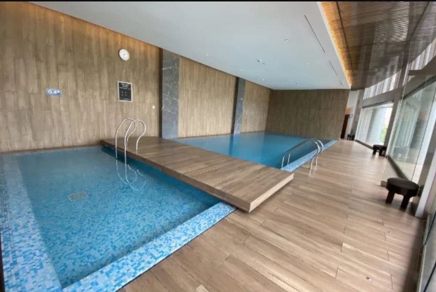 An elegant 24sqm studio in Jakarta's center, blending style and convenience. Includes kitchen, fast Wi-Fi, air-purification, 43" smart TV, sound system and Netflix. It is ideal for various stay types, with contactless access and amenities like pools, jacuzzi, gym, and basketball, Now features a Reverse Osmosis dispenser & food waste disposal, The picture shows a gas stove that has been replaced by an induction cooker (to follow the apartment guidelines for fire hazards)