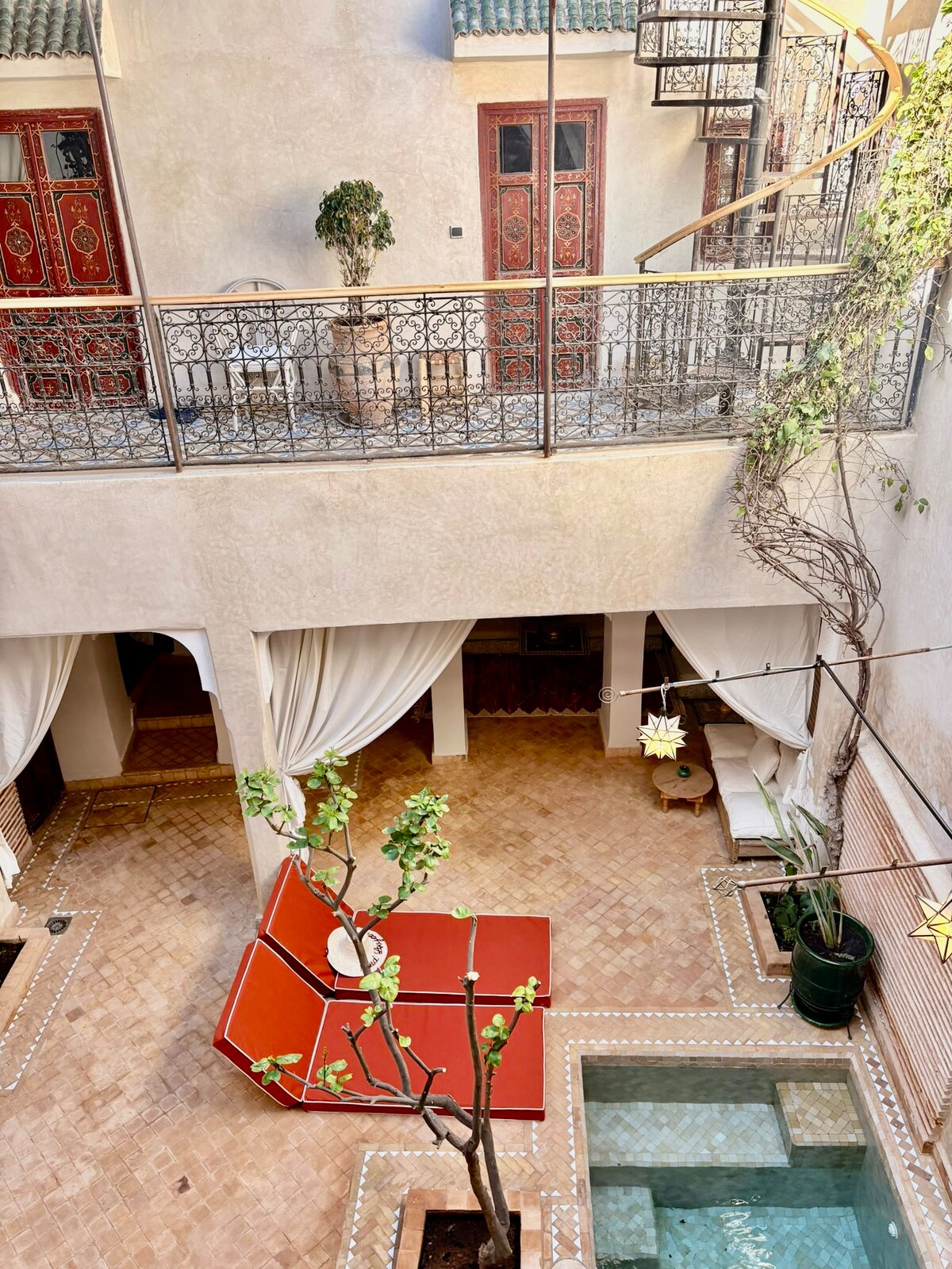 ☀️ Entra, deja tus maletas; nosotros nos encargamos del resto. Tu riad privado en el corazón de Mouassine: piscina, azotea y, todas las mañanas, Amina prepara un desayuno marroquí casero solo para ti. Servicio de limpieza diario y sábanas limpias incluidas. No hay espacios compartidos: todo el riad es solo para ti. Relájese, explore, saboree: a solo 5 minutos a pie de Jemaa el-Fna. Bienvenido a casa. 🌴
