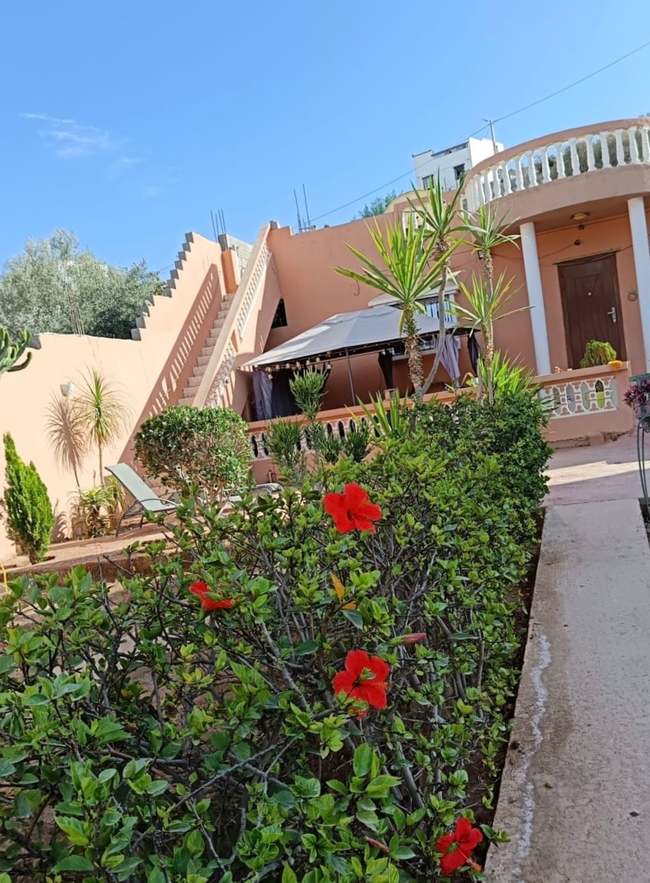 Este alojamiento tranquilo ofrece una estancia relajante para toda la familia. Situada a 25 minutos al sur del centro de Agardir , a solo 20 minutos del aeropuerto y a 8 km de la playa de Sidi toual y a 1 km del centro del pueblo de TAKAT , la tranquilidad del campo te espera. «Dar nawara» es una villa de 300 m2 de una sola planta , construida en una parcela de 2200 m2 totalmente amurallada y sin vecinos.