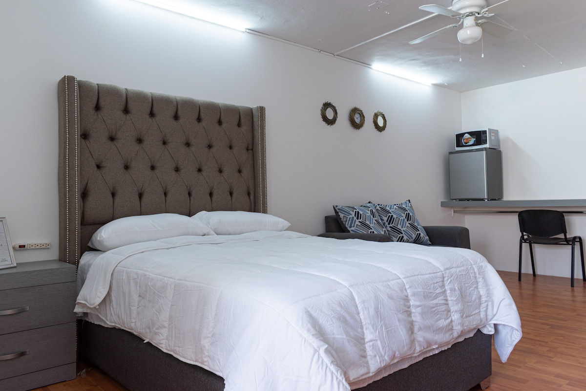 Alojamiento amplio para hasta 3 personas en una zona con mucha actividad durante el día y ambiente tranquilo por la noche. Ideal para quienes se mueven caminando o en transporte público. Cuenta con WiFi, TV por cable, dos camas matrimoniales, sala, refrigerador, microondas solo lo básico para cocinar algo simple. Tiene agua caliente por calentador solar. No cuenta con estacionamiento y la calle suele ser concurrida durante el día. La zona es muy concurrida y comercial durante el día.