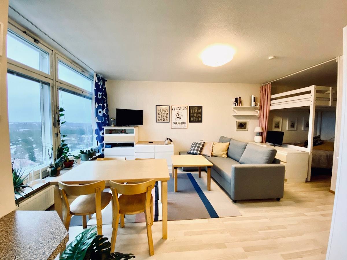 Welcome to my cozy 33m² apartment in Puotinharju, Helsinki! This stylish studio is ideal for solo travelers or couples. It features a fully equipped kitchen, a living area, and a bathroom with a washing machine. The closest metro station is just 550m away (an 8-minute walk), and you can reach central Helsinki in under 20 minutes. Nearby, you'll find the historic Puotilan Kartano and Itis, one of Finland's largest shopping mall with plenty of shops.