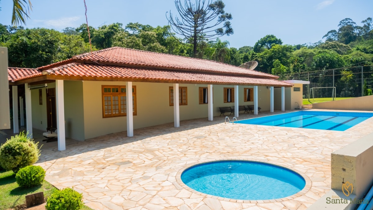 Casa llena de encanto y también súper acogedora, a 70 km de la capital de São Paulo, casa con varias terrazas, con parque infantil, piscina amplia, habitaciones superespaciosas, sala de juegos, barbacoa con horno de pizza, chimenea, casa con vista al lago, se puede practicar la pesca, tenemos plazas para coches dentro de la granja, ¡lugar súper tranquilo y seguro!