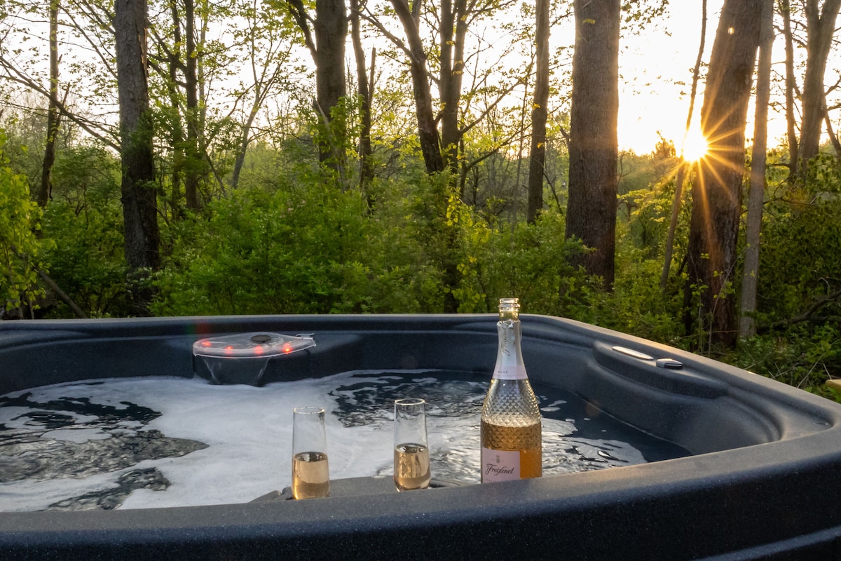 Jacuzzi bajo las estrellas en una acogedora cabaña en el FLX