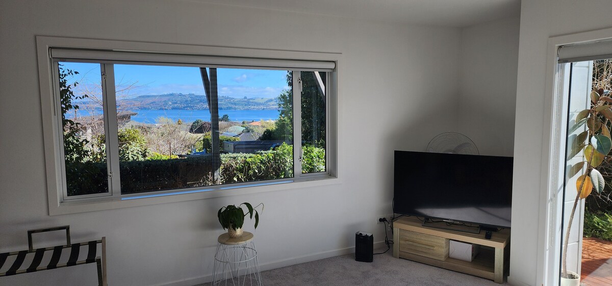 Relájate y desconecta en este alojamiento tranquilo y elegante. La vista al otro lado del lago, hacia Acacia Bay, te mantendrá hipnotizado. Entrada a través de una puerta corrediza de rancho desde tu propia terraza orientada al norte. Hay acceso privado disponible al Jardín Botánico, donde los árboles nativos maduros proporcionan un dosel exuberante que cubre impresionantes paseos antes de que te acomodes con una copa de vino en tu propia terraza mirando el lago y escuchando toda la vida de las aves. Se incluye un dormitorio separado con una cama tamaño queen, un moderno baño de azulejos y televisión inteligente.