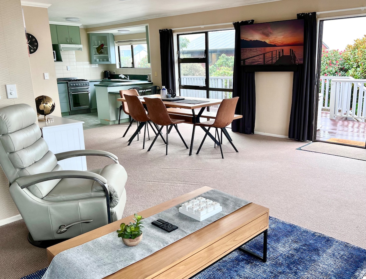 Wake up to lake views, step out onto the deck with your morning coffee, and wind down in the evening as the light fades over the water. This spacious home in Taupō is perfect for families and groups. Comfortably sleeping up to 10 guests. Fully equipped kitchen (air fryer, coffee machine & more) Smart TV + WiFi for relaxing nights in Off-street parking + secure garage Tesla wall charger with free EV charging Washer/dryer combo 3 bedrooms + sofa bed in the lounge Sleeps up to 10 guests