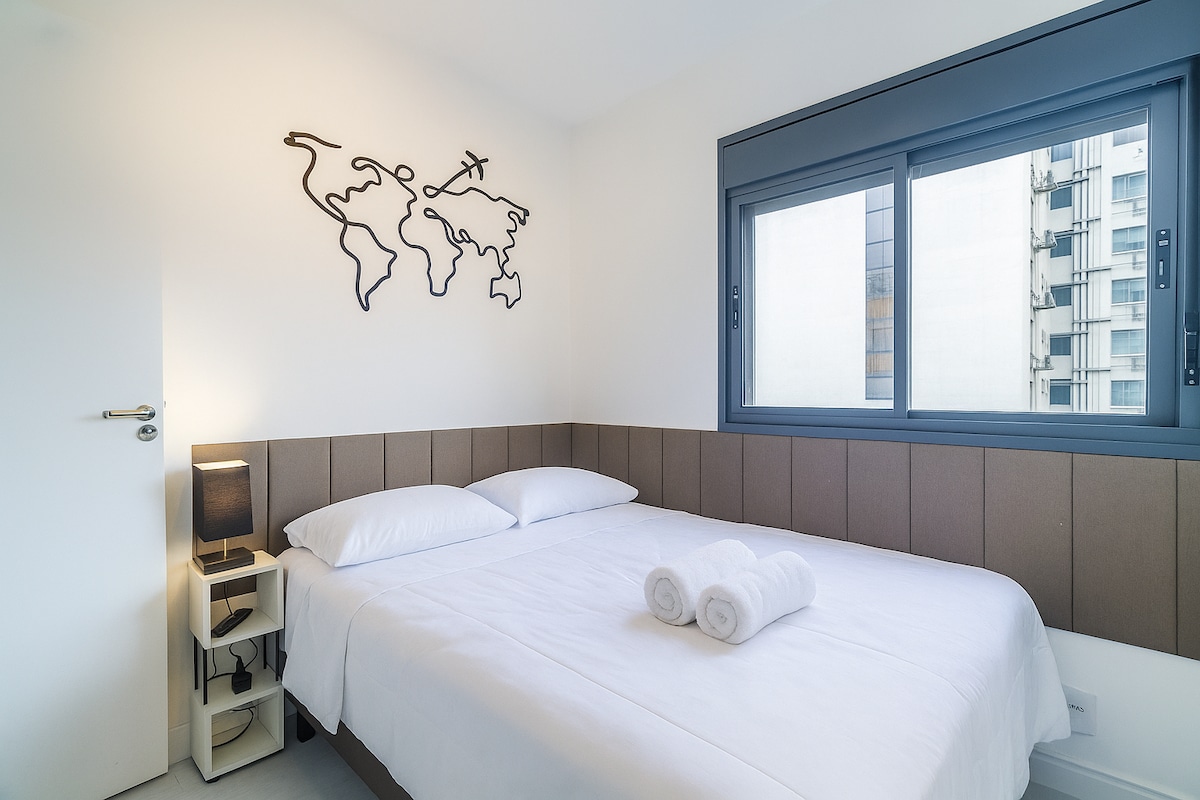 Este elegante apartamento de 50 m2 ubicado en Bela Vista, tiene portero las 24 horas. 2 dormitorios (solo 1 con aire acondicionado y cama tamaño queen, el segundo es bastante pequeño y se puede utilizar como oficina, con un sofá cama de tamaño doble) y 1 baño. Con vistas increíbles desde todas las ventanas, es un lugar fantástico para trabajar y relajarse. El jet metro privado en el balcón es un lugar fantástico para disfrutar de las vistas de la ciudad. Estacionamiento: televisión por cable/inteligente, nevera con máquina de hielo, horno, lavadora y secadora, encimera, microondas, lavavajillas e internet ultrarrápido.