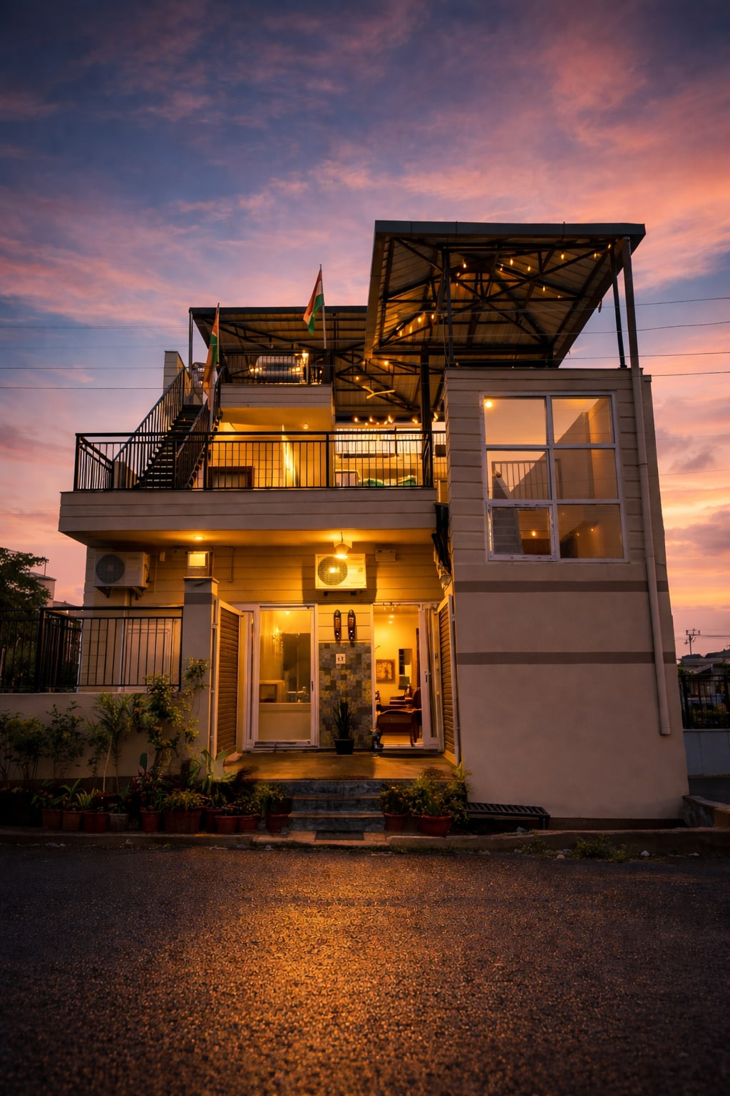 "Welcome to our tastefully curated homestay, where comfort meets style. Adorned with elegant panels, ambient studio lights, and a 55-inch TV, our space is designed for groups to unwind and relax peacefully. Please note, to ensure a peaceful environment for all guests, we kindly request lowering music by 10:30 PM, and we appreciate your understanding in refraining from loud noises thereafter.