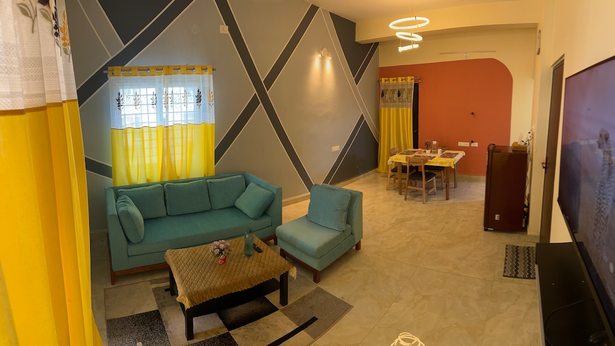Disfruta de una estancia tranquila en esta casa de 1 BHK, ideal para familias y grupos pequeños. ✨ El espacio Sala de estar compacta con un colchón de espuma viscoelástica tamaño king California de 12" y un sofá reclinable de 2 plazas. Cocina funcional con UV + RO Aquaguard. Dormitorio principal: colchón de espuma viscoelástica tamaño queen, armarios grandes, baño adjunto y lavabo. Un baño separado (independiente). Mesa de comedor de 6 plazas con lavabo. Alojamiento sin aire acondicionado en invierno; se puede proporcionar un enfriador de aire previa solicitud.