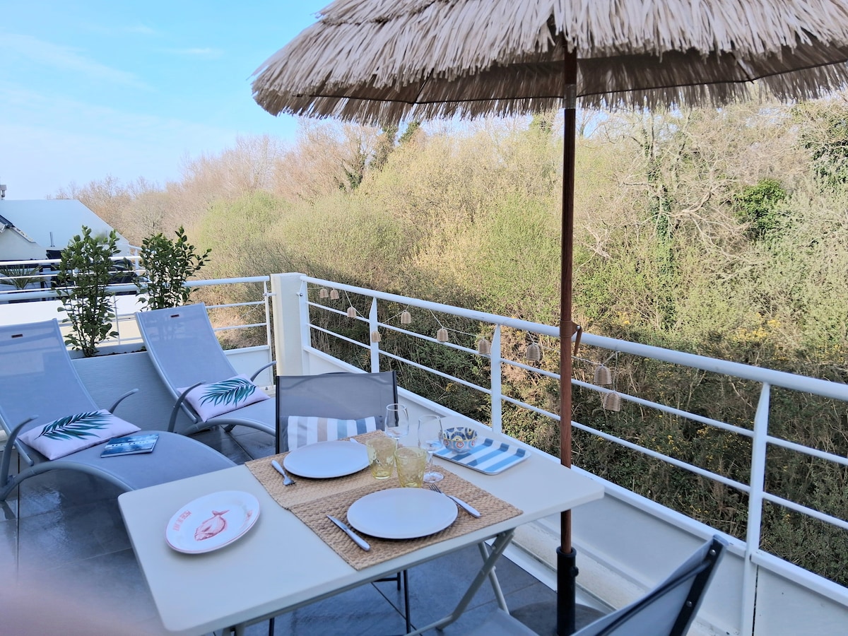 Encantador estudio con altillo, ubicado en el corazón de la ciudad de los pintores que se hizo famosa por Paul Gauguin y la escuela de pintura de Pont-Aven. El estudio se encuentra en un ala de nuestra casa y tiene dos entradas para acceder a ella. Tiene una zona de comedor al aire libre al pie de la escalera y una terraza con muebles de jardín y tumbonas. El jardín y la terraza se pueden iluminar por la noche. Está a 200 metros del centro de la ciudad y del museo y muy cerca del puerto.