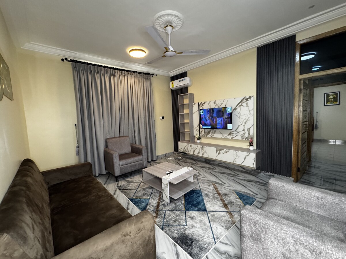 A fully furnished one-bedroom apartment overlooking the Tema Harbour expansion and a five minutes drive away from the Sakumono beach. The Apartment is located in a peaceful and safe community with asphalted road. It offers a cozy space for individual and families on vacation and those seeking an escape from the busy and noisy environments. The vile is suitable for both long and short stays. The address is accessible via all the rider apps.