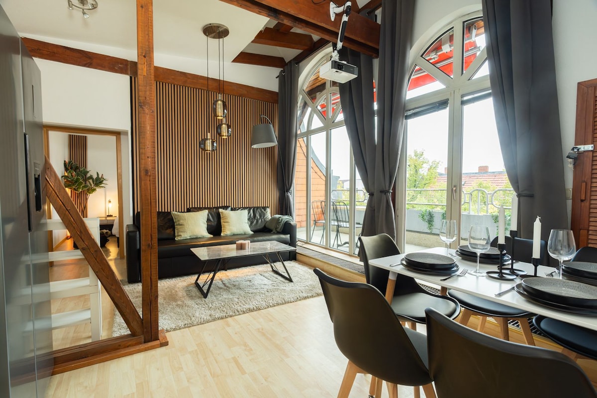 DasGeburtshaus der "Marlene Dietrich. Im 3. Stock im Hinterhaus befindet sich das Apartment. Es wurde renoviert in einem Stil, der Elemente eines Industrielooks und der, der 50 Jahre. Das Apartment hat 43 qm und ist ein offener Raum. Das Bad ist mit einer Glaswand vom Wohnraum getrennt. Die Küche ist offen in den Wohnraum integriert. Der Schlafplatz ist auf einem Podest. Es gibt auch ein WLan.. Vor der Türe halten 2 Buslinien,. Anbindung an die S-Bahn ist nur ca. 5 Minuten zu Fuß entfernt.