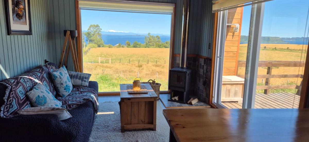 Hermosa cabaña en medio de Chiloé rural. La cabaña está situada específicamente en Teguel Bajo, una pequeña comunidad a 4,5 km de la ciudad de Dalcahue. Se trata de un lugar en medio del campo, rodeado de bosques nativos, a pocos metros del Humedal de Teguel y con una preciosa vista al canal Dalcahue. En el primer piso hay un amplio espacio en donde está la cocina, living, comedor y el hot tube. En el altillo está la habitación principal con una cama de 2 plazas.