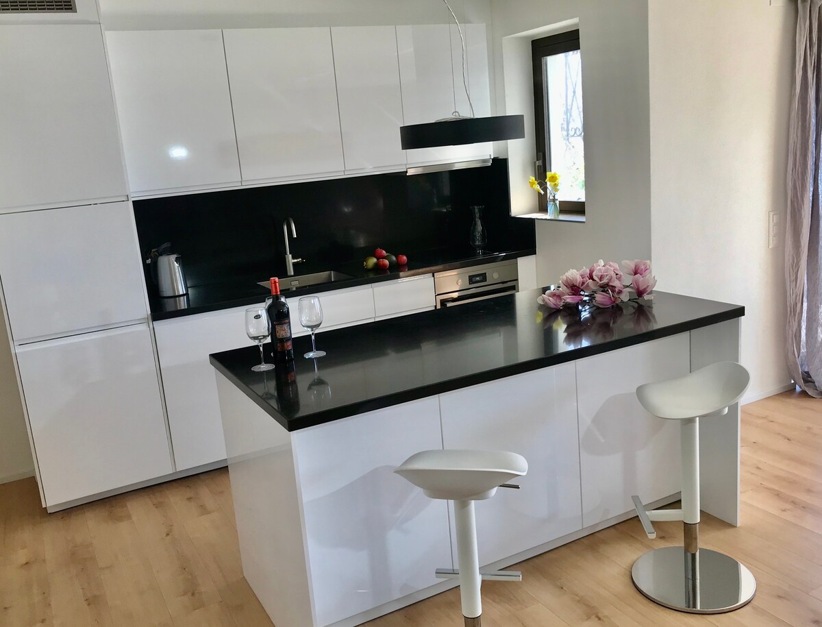 Apartamento moderno rodeado de naturaleza, ubicado en la PB de la residencia Buca10Home. Vista al campo de golf de Losone. A 3 km del centro de Locarno y Ascona. Cuenta con salón luminoso, cocina equipada, dormitorio, balcón y jardín privado. Ideal para tomar el sol , perfecto para comer al aire libre. Zona tranquila, rodeada de las montañas del Valle Maggia y las Centovalli. Bien conectado con transporte público, cerca de restaurantes y supermercados. Ideal para amantes de la naturaleza.