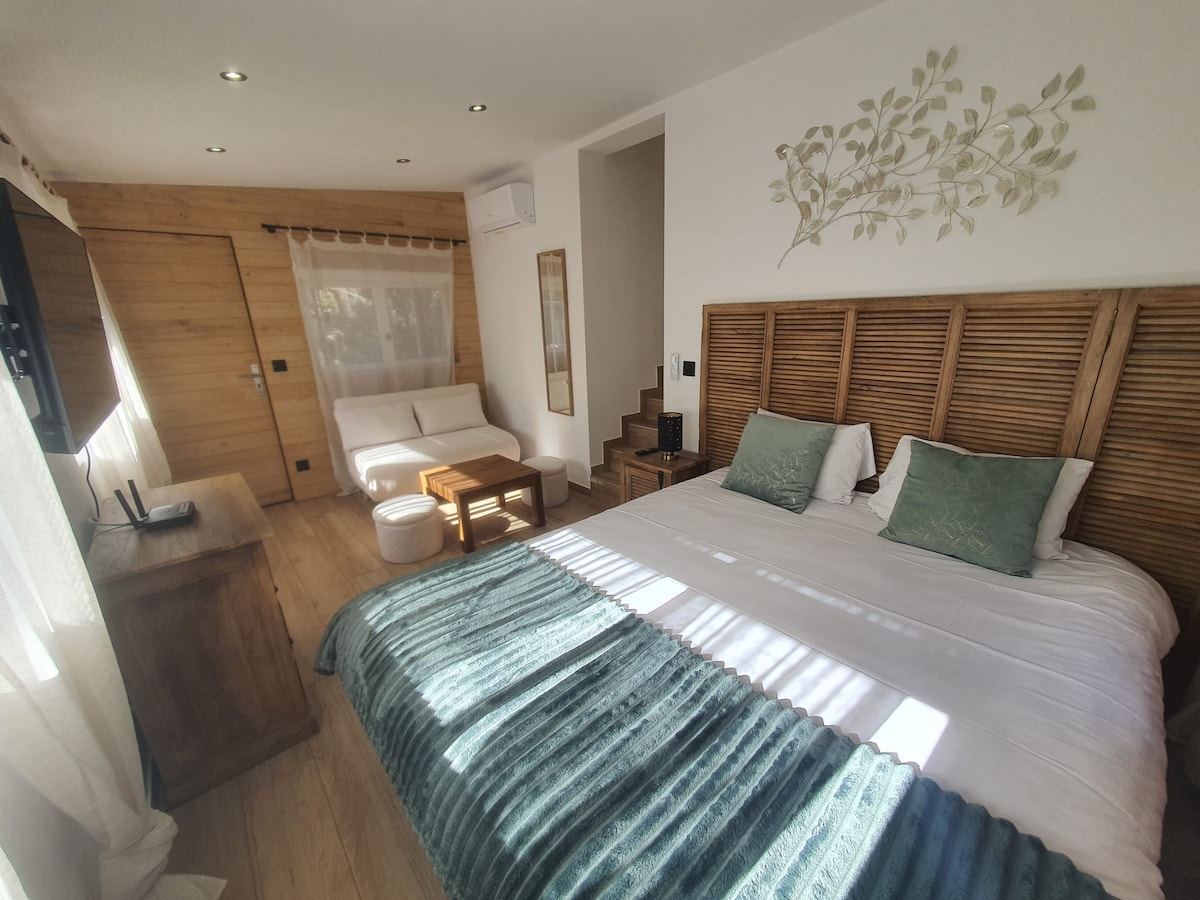 Estudio con aire acondicionado cálido y limpio, con todas las comodidades, muy tranquilo de 21 M2 con entrada independiente sin promiscuidad. Café de bienvenida, expreso, té, agua mineral,magdalenas,leche,mantequilla,cruasán, mermelada,microondas, Bicicleta en préstamo a su disposición Cerca del famoso restaurante LES GRANDS BUFFETS, el zoológico, el centro de la ciudad y las playas. Aparcamiento a 10 m para su vehículo (garaje para motos) Autobús en las cercanías para llegar al centro de la ciudad. Un televisor de 32" a su disposición en el estudio.