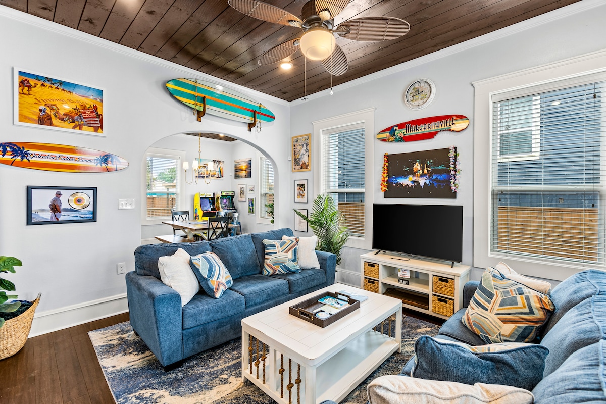 -Casita De Palmera- Relax on the lighted, palapa-covered deck with your coffee or cocktail! Family + pet friendly! Less than a half mile to Galveston's Historic Downtown area and a short 4 minute drive to the beach! Close to all of the fun, shopping, live music and restaurants on The Strand! -Fenced backyard -800+ MBPS Wifi -4 Smart TVs w/ Roku capability to stream with your accounts -Arcade & board games -Wood Grill -Beach towels & toys Close to cruise terminals & ONE block to cruise parking!