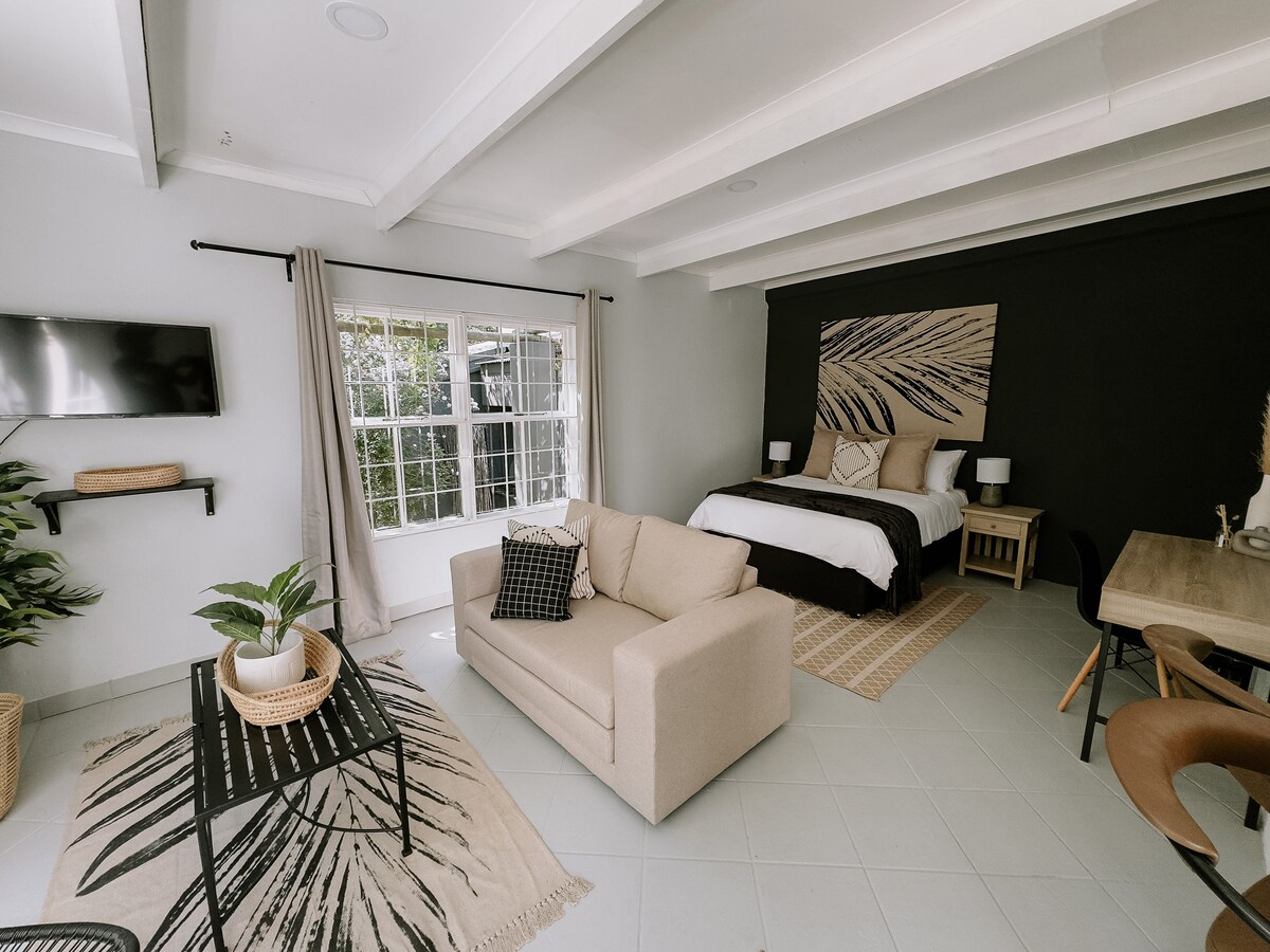 Alójate en el corazón de Clarens mientras disfrutas de total privacidad. El estudio es un espacioso apartamento de un dormitorio de 85 metros cuadrados con baño privado, sala de estar de planta abierta y patio privado. La energía solar garantiza un confort ininterrumpido. Disfruta de DSTV completo, wifi gratuito, una cocina de gas y un braai Weber. Aparcamiento seguro detrás de una puerta motorizada. A poca distancia a pie de restaurantes, tiendas y pubs. Llegada autónoma. Reserva el loft de arriba para grupos más grandes. Un refugio privado y moderno a pocos pasos de la plaza del pueblo.