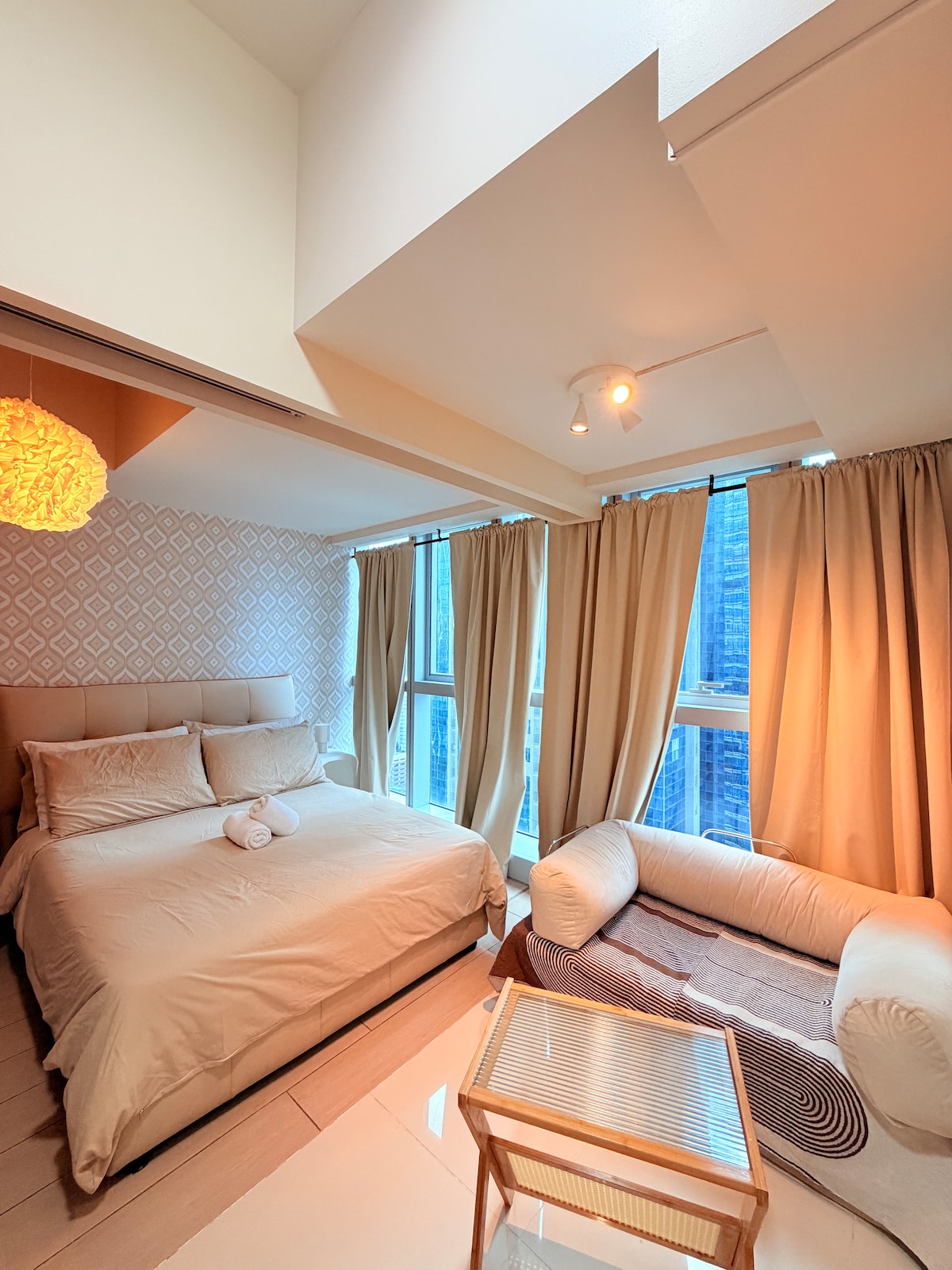 This cozy, warm, and charming studio boasts a stunning skyline balcony view—it's even more impressive in person. See for yourself and feel at home. The bed features a medium firmness, soft cotton pillows, and bedding for a relaxing night's sleep. Located right beside the Venetian Grand Canal Mall—great for strolling, coffee, and easy meetups in a warm, welcoming vibe. You’ll genuinely feel the coziness and warmth in person. Convenience at your doorstep: - LAWSON’s across the building