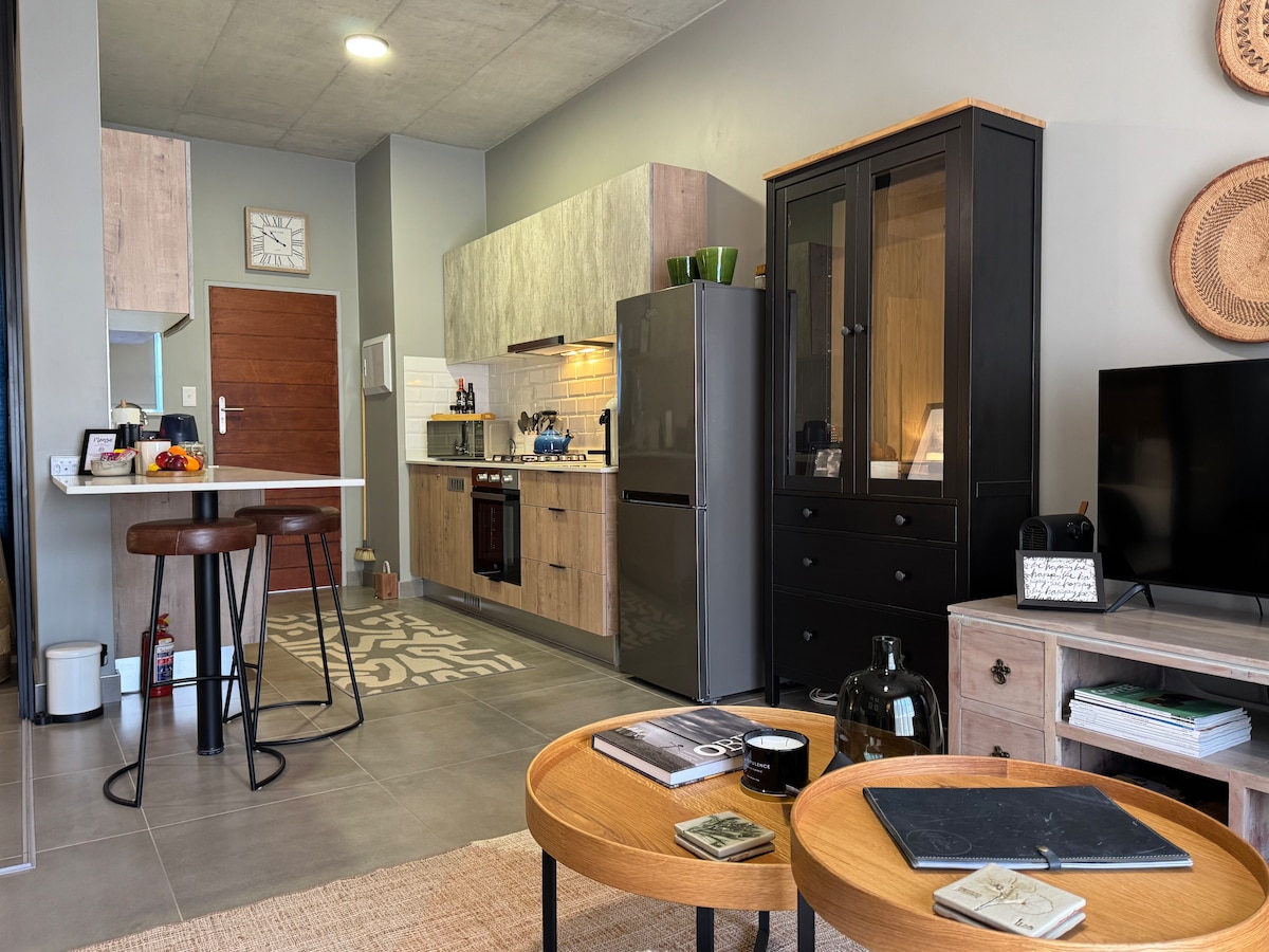 Relájate en este espacio tranquilo y elegante. Esta suite independiente está situada en una finca de seguridad las 24 horas junto a Silver Lakes Golf Estate y tiene capacidad para 2 personas. El apartamento tiene su propio estacionamiento dedicado con entrada privada, sala de estar de planta abierta, cocina completa, estación de trabajo y wifi gratuito. Relájate en un dormitorio moderno con una cama tamaño king, aire acondicionado, persianas y baño privado. La suite es muy privada con su propio jardín. Sin reducción de carga: sistema solar.