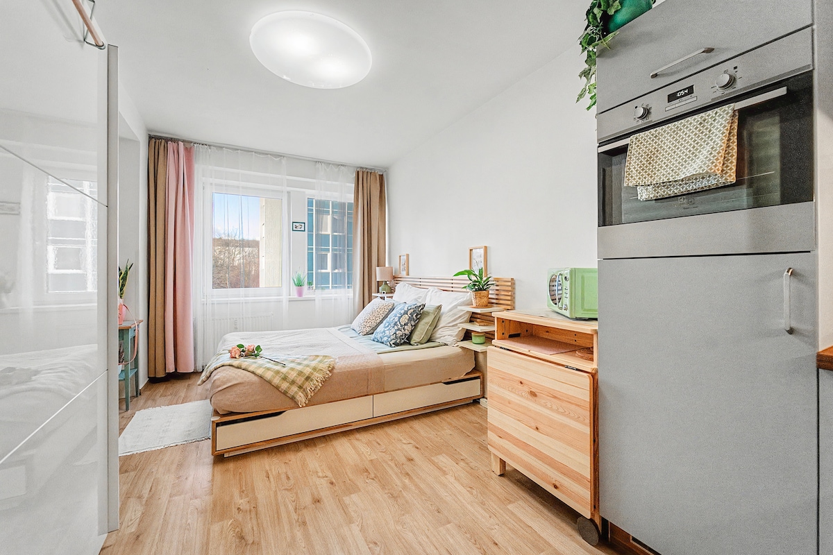 Apartamento tipo estudio moderno, acogedor y súper limpio de fácil acceso al casco antiguo de Praga (15 minutos). Llegada autónoma (a partir de las 5:00 p. m. o antes según la solicitud). WIFI (50 Mb/s), NETFLIX, café y té de forma gratuita. A 5 minutos a pie de la estación de tranvía (a continuación, a 15 minutos del centro antiguo). A 10 minutos a pie de la estación de metro (a continuación, a 4 minutos del centro antiguo). 1 doble malo (200 cm x 160 cm), cocina equipada. 1 baño con esquina de ducha, inodoro,lavadora (secador de pelo).