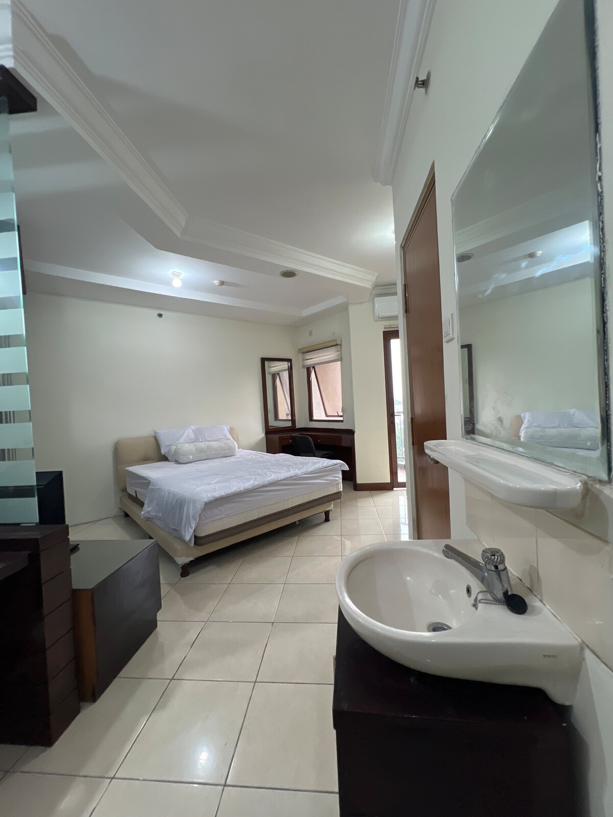 Bienvenido a nuestro acogedor estudio de 35 m² en Dago Suites Apartment Bandung. Ubicado en el piso 11, disfrutarás de impresionantes vistas de la ciudad desde tu balcón. El estudio ofrece una lujosa cama King Koil y dos colchones adicionales en el piso, perfectos para un máximo de 4 huéspedes. Mantente entretenido con nuestro televisor inteligente 4K de 55 pulgadas, completo con Netflix, Disney+, HBO Max, IQIYI y Viu. Mantente conectado con wifi rápido de 20 Mbps. Ten en cuenta que el estacionamiento, tanto para motocicletas como para automóviles, solo es sin efectivo.