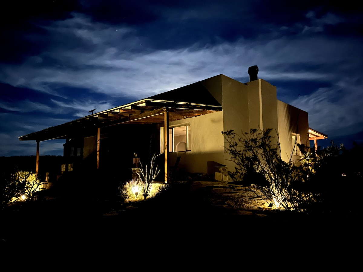 * A 10 MINUTOS DEL PARQUE NACIONAL BIG BEND * ¡Privado, pero cerca de todo! *¡Propiedad local/operado! * Encantadora cabaña ecológica de 324 pies cuadrados para 2 adultos (sin niños) *AIRE ACONDICIONADO FRÍO, calefacción * Duchas interiores y exteriores. *Chimenea de leña de gas *Cama tamaño queen súper cómoda *Cocina pequeña. * Baño completo y baño de compost limpio *Impresionantes vistas del parque nacional Big Bend *Sostenible, con ENERGÍA SOLAR * Vistas a la montaña al amanecer desde tu almohada *¡Increíble observación de estrellas! *¡Ven a disfrutar de esta joya única del desierto, crea recuerdos para toda la vida!