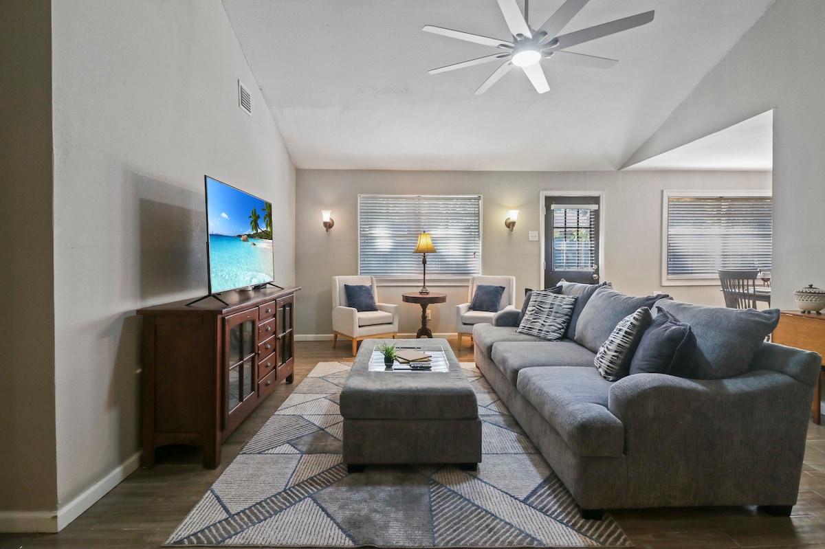 Welcome to Serenity Stays at Sandpebble! This spacious 3 bedroom, 2 bathroom patio home is perfect for the whole family, kids too! The open concept living allows for fun between friends while the outdoor scene welcomes the barbeque lovers. Our fully equipped kitchen opens to one of three patios. Each patio offers its own unique area for activity including a firepit, gas grill, outdoor dining and plenty of lounge area. Get creative and host your next family event under the string lights!